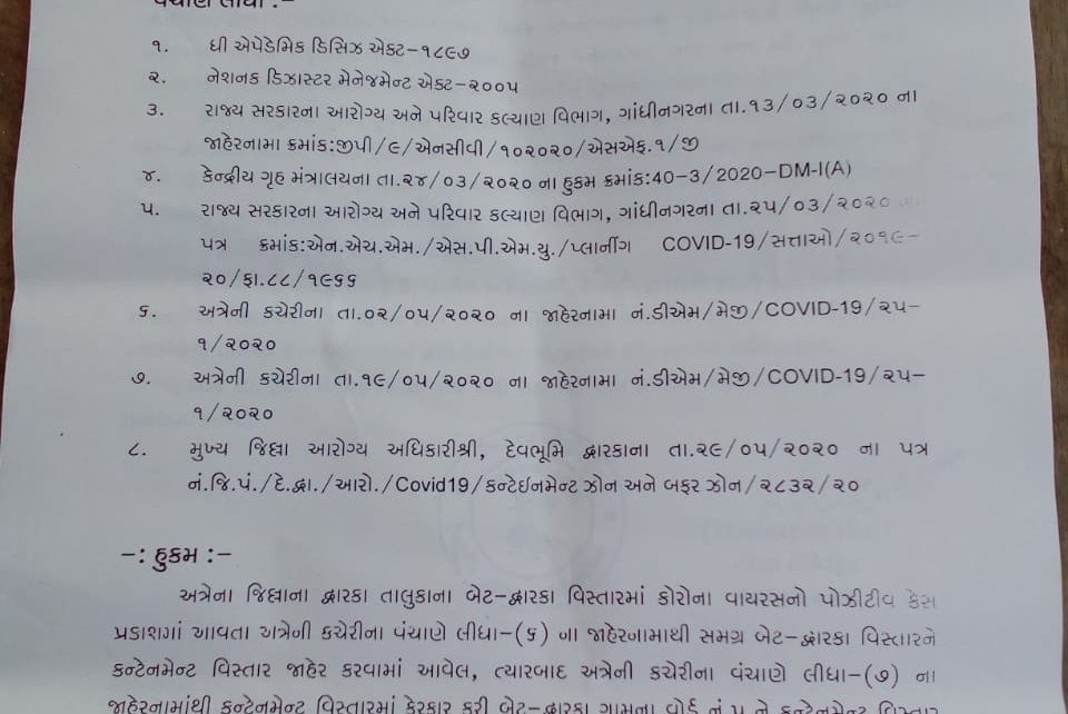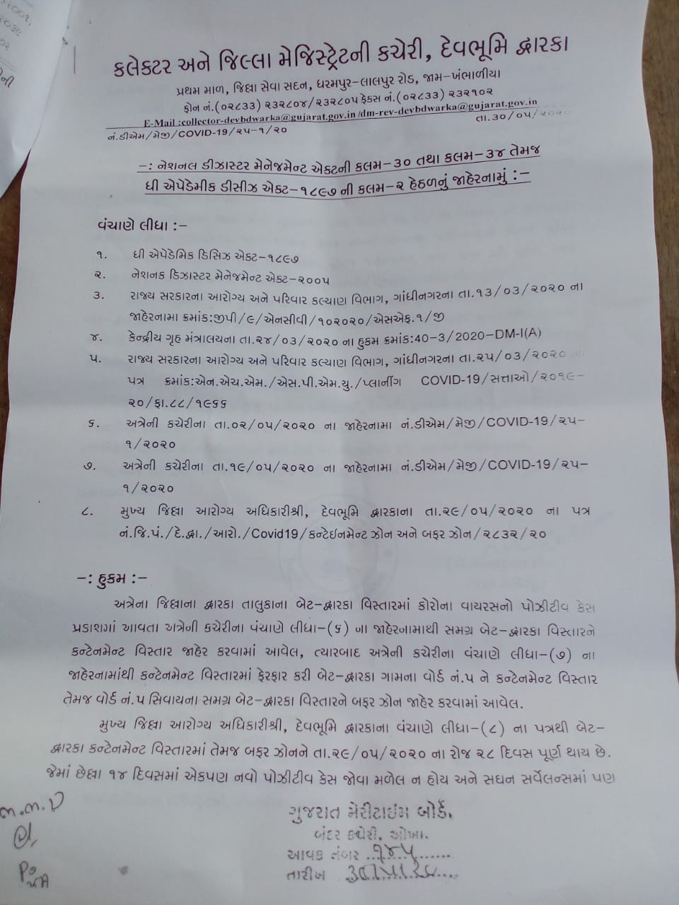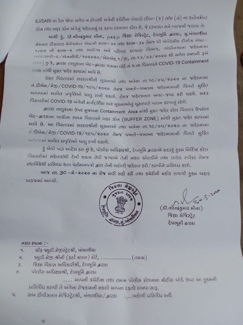 દ્વારકા… દેવભૂમિ દ્વારકા જિલ્લાના દ્વારકા તાલુકાના બેટ દ્વારકા ગામને કંટેઈનમેન્ટ ઝોન અને બાફર ઝોન માંથી મુક્ત કરવામાં આવ્યું.