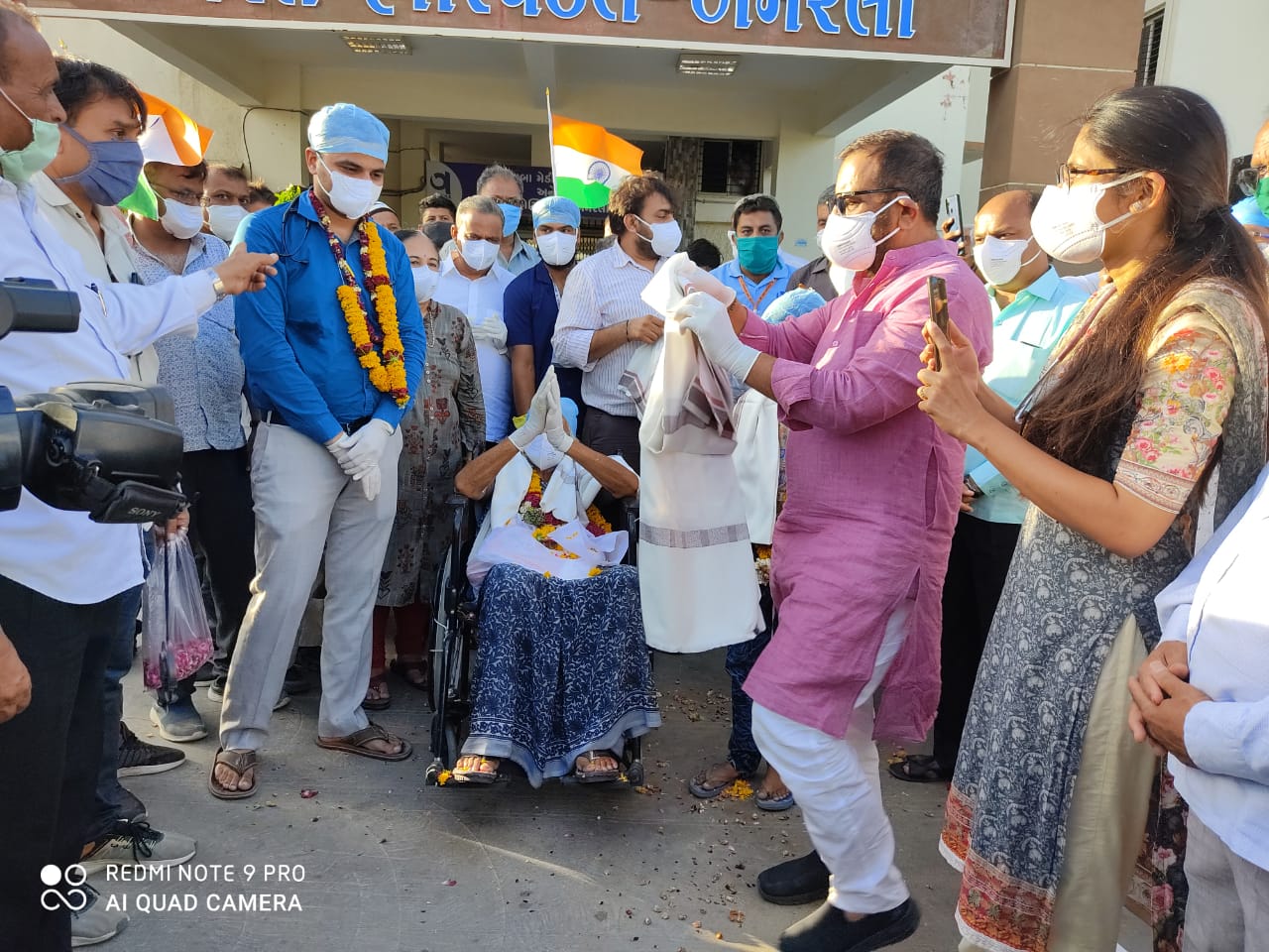 આજરોજ અમરેલી સદભાવના ગ્રુપ ચાંદની ચોક તથા અમરેલી જનરલ સીવીલ હોસ્પિટલ માંથી કોરોનના 2 દર્દી લાભુબેન ટીમબલા ના અને ઓમ જે 11 વર્ષ નો બાળક જે બગસરા વતની તેઓ ને આજે સંપૂર્ણ નિરોગી બની કોરોના સામે જગજીતી અમરેલી સિવિલ હોસ્પિટલમાંથી રજા આપી હતી અમરેલી સિવિલ હોસ્પિટલ ના તમામ ડોક્ટર મેડિકલ સ્ટાફ સફાઈ કર્મચારી મીડિયા તમામ ને સન્માનીત કરી આજરોજ અમરેલી સિવિલ હોસ્પિટલ દ્વારા કોરોના યોદ્ધાઓ ને કરાયા સન્માનીત આ સમગ્ર આયોજન સદભવના ગ્રુપ ના પ્રમુખ અજિજ ભાઈ ગોરી અમરેલી સિવિલ હોસ્પિટલ ના ટ્રસ્ટી વસંત ભાઈ ગજેરા મેડિકલ ઓફિસર સતાણી સાહેબ પિન્ટુ ભાઈ ધનાણી ડો ભરત ભાઈ કાનાબાર દ્વારા કરવા મા આવ્યું હતું