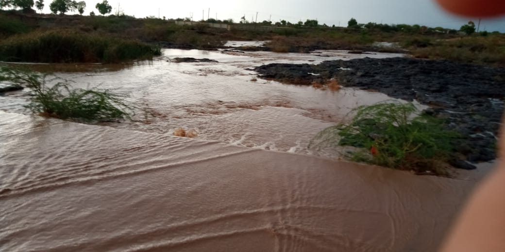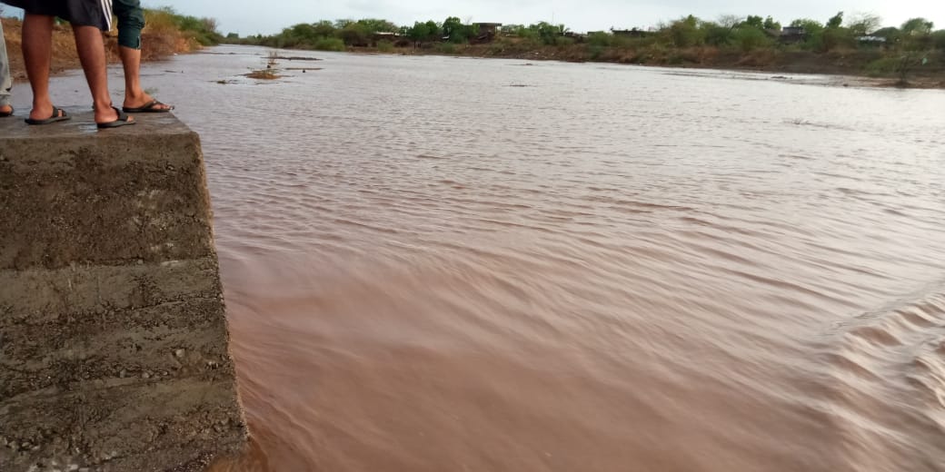 આજે બપોર બાદ વરસેલા ધોધમાર વરસાદ થી દામનગર તાબાનાં મુળીયાપાટ ગામમાં થી પસાર થતી રંઘોળી નદીમાં બે કાંઠે પુર આવતાં વાહન