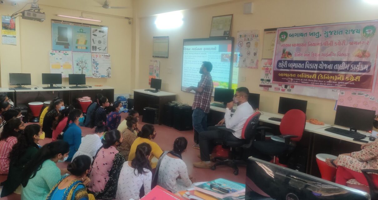 આજરોજ બાગાયત વિભાગ, ગુજરાત રાજ્ય દ્વારા શહેરી વિસ્તારમાં વસતાં નાગરીકોમાં જાગૃતતા હેતુ  અર્બન હોર્ટીકલ્ચર ડેવલપમેન્ટ અંતર્ગત સમગ્ર રાજ્યમાં દરેક જિલ્લા કક્ષાએ તાલીમનું આયોજન કરવામાં આવેલ હતુંજે અન્વયે નાયબ બાગાયત નિયામક કચેરી, જામનગર દ્વારા I.T.I. (મહિલા)–જામનગર ખાતે શહેરી બાગાયત વિકાસ યોજના તાલીમ કાર્યક્રમનું આયોજન કરવામાં આવેલ હતુંજેમાં કુલ ૫૦ જેટલા મહિલા તાલીમાર્થીઓએ ભાગ લીધેલ હતો. કાર્યક્રમમાં ગુજરાત ચેમ્બર ઓફ કોમર્સ, ગાંધીનગર ખાતેથી જીવંત પ્રસારણ દ્વારા ગુજરાત રાજ્યના બાગાયત નિયામકશ્રી ડો. પી. એમ. વઘાસીયા દ્વારા પ્રાસંગિક ઉદબોધન કરવામાં આવેલ હતું. જિલ્લા કક્ષાએ કાર્યક્રમમાં બાગાયત અધિકારી (કેનિંગ) શ્રી વી. એચ. નકુમ દ્વારા અલગઅલગ આનુસંગિક વિષયો પર તાલીમ આપવામાં આવેલ હતી તેમજ મદદનીશ બાગાયત નિયામક શ્રી એચ. ટી.  ભીમાણી દ્વારા બાગાયત ખાતાની વિવિધ કામગીરી વિશે માહિતી આપવામાં આવી હતી. સમગ્ર કાર્યક્રમનું સંચાલન બાગાયત મદદનીશ શ્રી કે. આર. પિપરોતર દ્વારા સફળતાપૂર્વક કરવામાં આવેલ હતું.