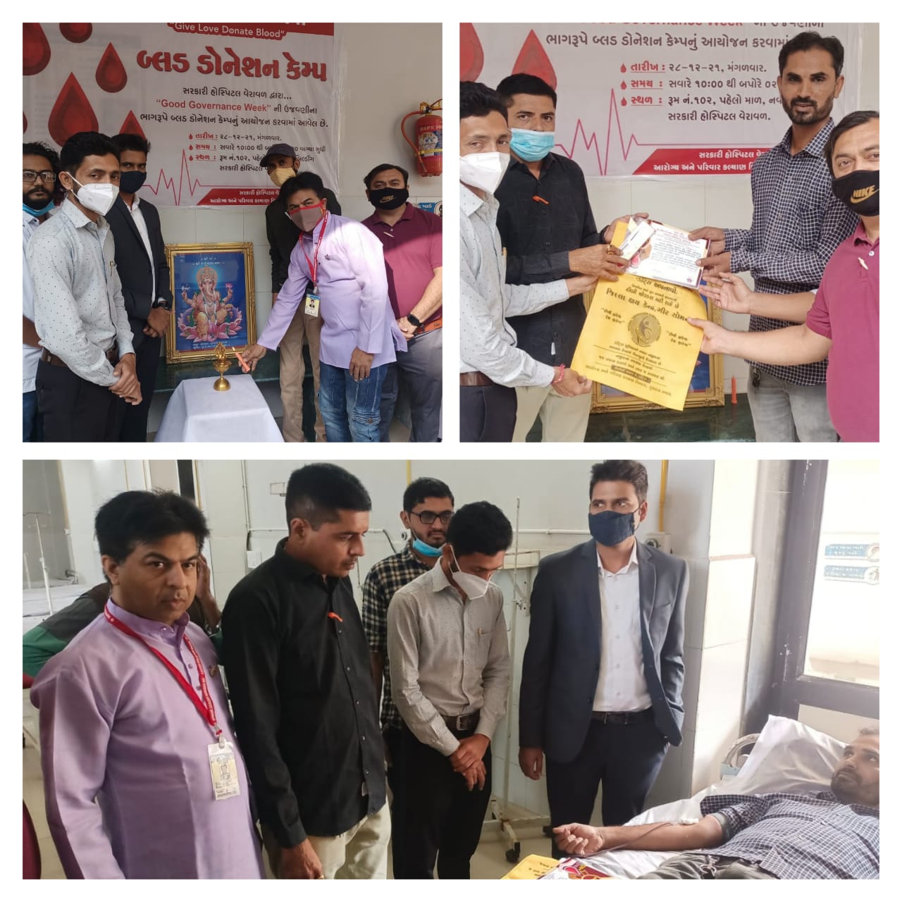 ગુજરાત રાજ્ય ના સરકારી વિભાગો દ્રારા “ગુડ ગવર્નન્સ વિક” અંતર્ગત જીલ્લા મા થેલેસેમીયા બાળકો તથા સગર્ભા મહિલા ના લાભાર્થીઓ ને બ્લ્ડ નિ જરૂરીયાદ પુરી કરવા ના પ્રયાસ રૂપી વેરાવળ સીવિલ હોસ્પિટલ ખાતે સવારે 10:00 થી બોપરે 2:00 સુધી રક્તદાન મહાદાન ને સાર્થક કરવા બલ્ડ ડોનેશન કેમ્પ યોજવામાં આવ્યો છે.