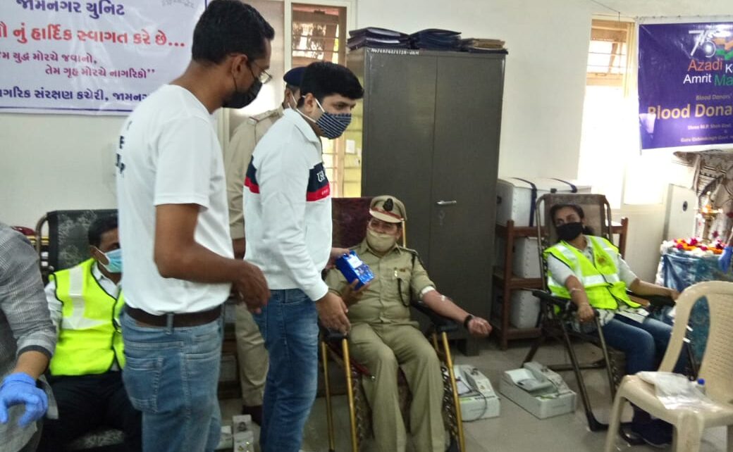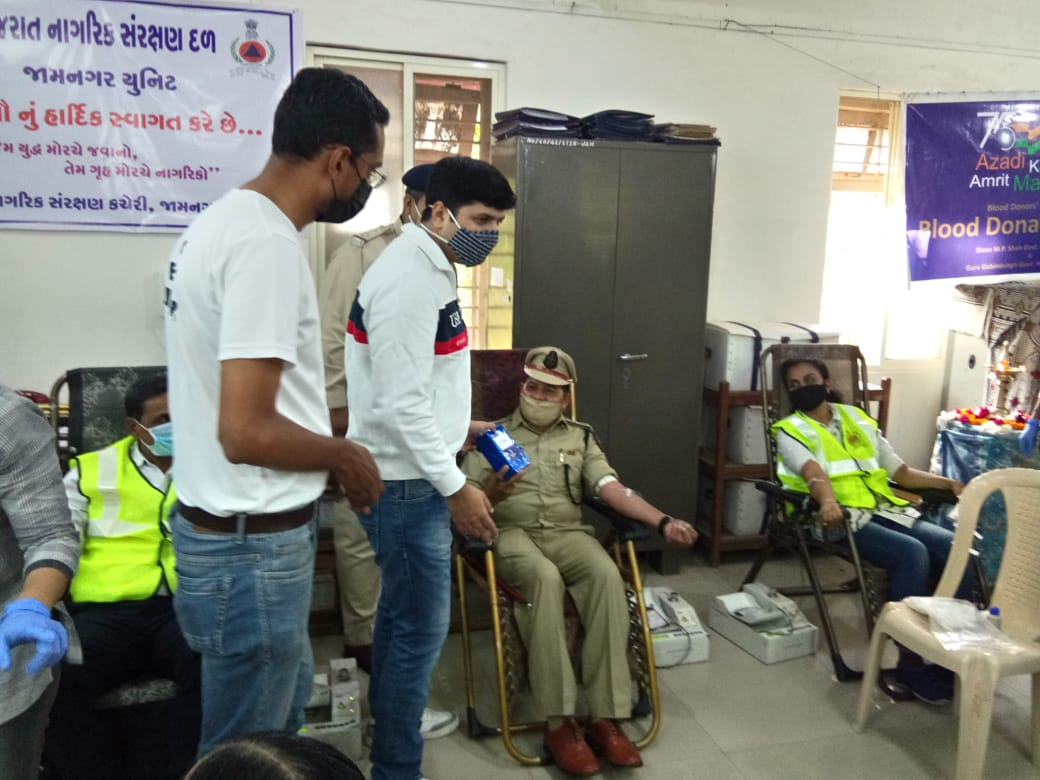 , ગુજરાત નાગરિક સંરક્ષણ દળના જામનગર યુનિટ દ્વારા નાગરિક સંરક્ષણ અને હોમગાર્ડઝના ૫૯માં સ્થાપના દિનની ઉજવણીના ભાગરૂપે જિલ્લા કક્ષાએ નાગરિક સંરક્ષણ કચેરી,લાલ બંગલા કંમ્પાઉન્ડ,જામનગર ખાતે રક્તદાન શિબિરનું આયોજન કરવામાં આવ્યુ હતુ.જેનુ જિલ્લા મેજીસ્ટ્રેટ અને નિયંત્રકશ્રી, નાગરિક સંરક્ષણ, જામનગરડો.સૌરભ પારધીએદિપ પ્રાગટ્ય કરીઉદધાટનકર્યુ હતુ.જેમાં પ્રથમ રકતદાતા તરીકે નાયબ નિયંત્રકશ્રી, નાગરિક સંરક્ષણકચેરી,જામનગર શ્રી વી.કે ઉપાધ્યાયના ધર્મપત્નિ શ્રીમતી શિલ્પાબેનઉપાધ્યાય દ્વારા રક્તદાનની શુભ શરૂઆત કરવામાં આવી હતી. આ રક્તદાન શિબિરમાં નાગરિક સંરક્ષણ દળના માનદ પદાધિકારીઓ, વોર્ડનો, કચેરી સ્ટાફ તથા ગૃહ રક્ષક દળ, જામનગરના કમાન્ડન્ટશ્રી, સબ ઈન્સ્પેકટરશ્રી તથા હોમગાર્ડઝ જવાનો વગેરેએ ખુબ ઉત્સાહ પુર્વક ભાગ લઈ રકતદાન કર્યુ હતું.