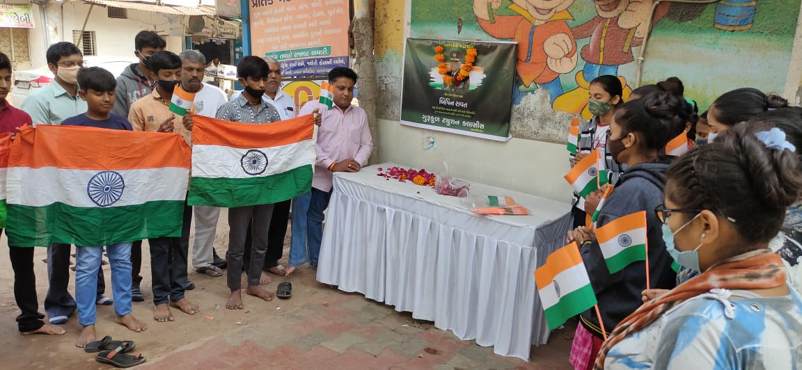 નાનાચિલોડા ટ્રસ્ટ સંચાલિત ગુરુકુળ ટ્યુશન ક્લાસીસ તેમજ આર જે ઠકકર પ્લે સ્કૂલ માં CDS બિપિન રાવત ને શ્રદ્ધાંજલિ આપવામાં આવી