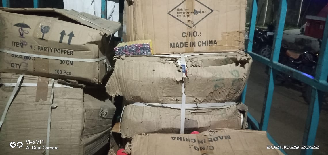 શ્રી એમ.એસ.ભરાડા સાહેબ, I/C પોલીસ મહાનિરીક્ષક, વડોદરા વિભાગ, વડોદરા તથા શ્રી ધર્મેન્દ્ર શર્મા સાહેબ પોલીસ અધિક્ષક, છોટાઉદેપુર તથા શ્રી જે.જી.ચાવડા સાહેબ I/C પોલીસ અધિક્ષક, છોટાઉદેપુર નાઓની સુચના અને માર્ગદર્શન હેઠળ શ્રી.જે.પી.મેવાડા, I/C પોલીસ ઇન્સ્પેકટર, એસ.ઓ.જી., છોટાઉદેપુરનાઓ તથા એસ.ઓ.જી. સ્ટાફના પોલીસ માણસો છોટાઉદેપુર પોલીસ સ્ટેશન વિસ્તારમાં પેટ્રોલીંગમાં હતા દરમ્યાન સિલ્વર સ્પુન હોટલ પાસે આવતા માહિતી હકિકત મળેલ કે, સ્વાગત હોટલની બાજુમાં કેવસીંગભાઇ રાઠવાની દુકાનમા છોટાઉદેપુરના મનીષકુમાર અશોકભાઇ અગ્રવાલએ ગેર કાયદેસર ફટાકડાનો મોટો જથ્થો રાખી મુકેલ હોવાની માહિતી મળતા ઉપરોક્ત માહિતીવાળી જગ્યાએ આવતા એક ઇસમ હાજર મળી આવેલ જેથી મજકુર ઇસમને ફટાકડા વેચાણનું લાયસન્સ રજુ કરવાનું કહેતા નહી હોવાનું જણાવતા હોય જેથી મે. કલેક્ટર અને જીલ્લા મેજીસ્ટ્રેટ સાહેબશ્રી છોટાઉદેપુર ના જાહેરનામાનો ભંગ કરેલ હોય મનીષકુમાર અશોકભાઇ અગ્રવાલના ગોડાઉનમાથી ભારતીય બનાવટ તથા વિદેશી મેડ ઇન ચાઇના ના ફટાકડાના બોક્ષ નંગ -૨૩, પેકેટ નંગ-૩૭૧૩ મળી કુલ કિ.રૂ. ૫૮.૯૭૦/- નો મુદ્દામાલ રાખી ગેર કાયદેસર રીતે પોતાના કબ્જા ભોગવટામા રાખી વેચાણ કરી મળી આવતા છોટાઉદેપુર પોલીસ સ્ટેશન B ગુરનં ૮૫૩/૨૦૨૧ ઇ.પી.કો.કલમ.૧૮૮ મુજબ ગુન્હો દાખલ કરાવી કાયદેસરની કાર્યવાહિ કરેલ છે અને આગળની વધુ તપાસ એસ.ઓ.જી. છોટાઉદેપુર નાઓ કરી રહેલ છે,