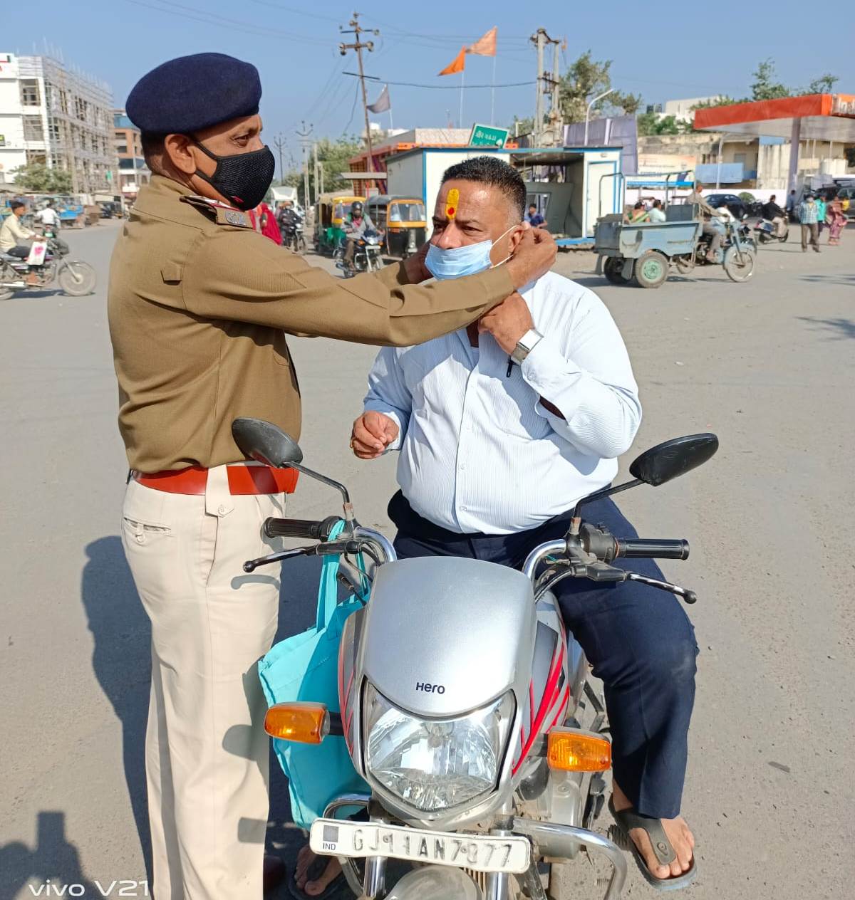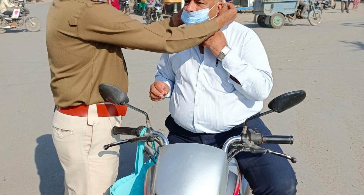 કોરોનાના કેઇસ વધતા તંત્ર પણ એલર્ટ બન્યુ હોય તેમ ઉના પોલીસ દ્રારા માસ્ક વગર નિકળતા રાહદારીઓને દંડ આપવાના બદલે માસ્ક પહેરવતા હતા. એ વખતે પ્રાંત કચેરીમાં શીરેસ્તદાર તરીકે ફરજ બજાવતા સાહેબ માસ્ક પહેરવાનું ભુલી ગયા હોય ફરજ પરના પી એસ આઇ એ માસ્ક પહેરાવ્યુ હતું….