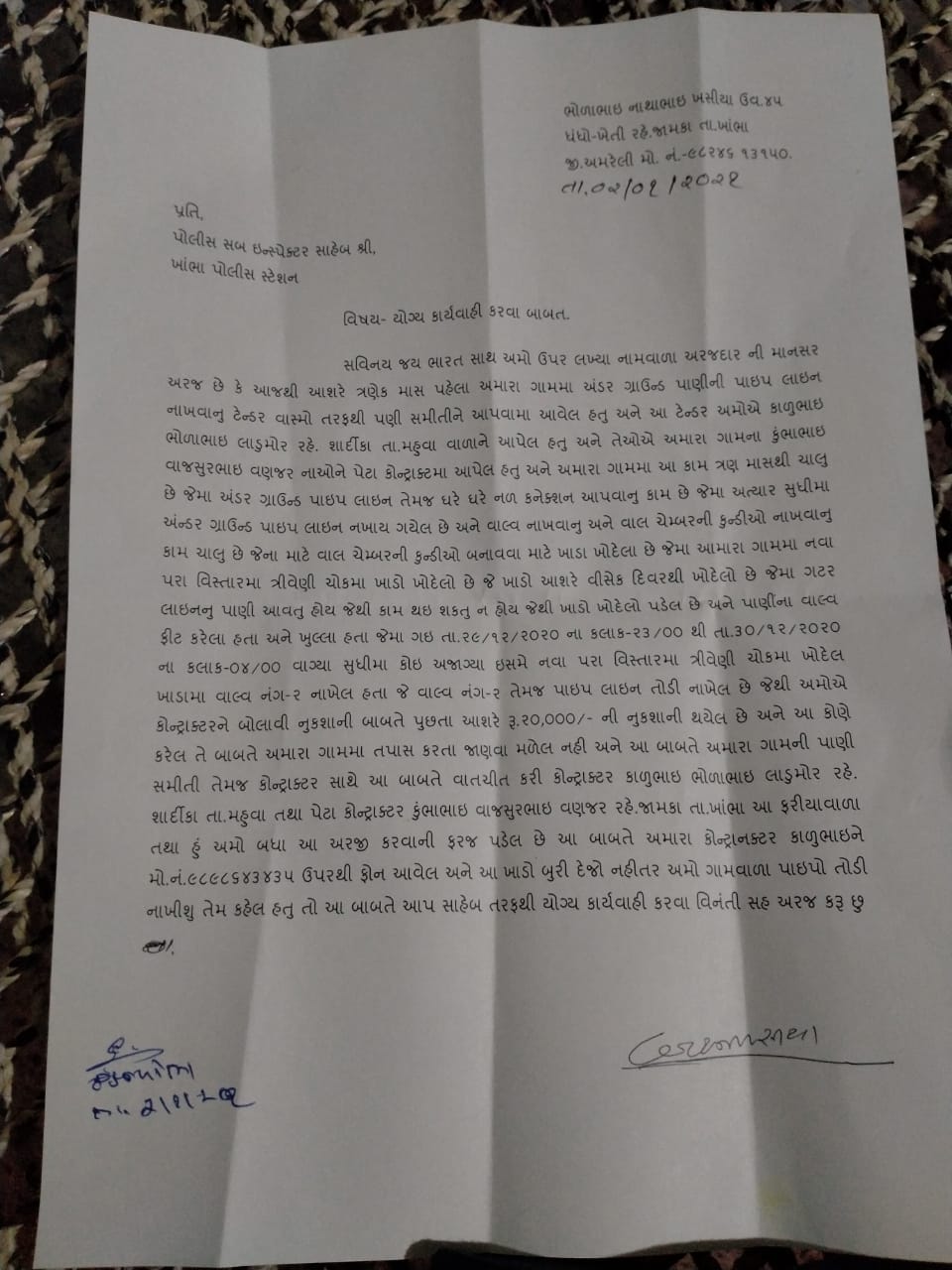 ખાંભા તાલુકાના જામકા ગામે ગ્રામ પંચાયત માં વાસ્મો યોજનાની અંડર ગ્રાઉન્ડ પાઇપ લાઇન નો કોન્ટ્રાક્ટ કાળુભાઇ ભોળાભાઈ લડુમોરને આપેલ હોઈ જેનું કામ હાલ ચાલુ હોઈ ત્યારે નવાપરા વિસ્તારોમાં ત્રીવેણી ચોક પાસે તા.29/12/2020 ના સાંજના આશરે 11 કલાક થી 30/12/2020ના રોજ સવારના 4:00 કલાકની વચ્ચે કોઈ અજાણ્યાં શખ્સ દ્વારા વાલ નં. 2 અને પાઇલાઇન તોડી નાખેલ હોઈ અને અંદાજે 20000 નું નુકશાન કરેલ હોઈ આ અંગે કોન્ટ્રાક્ટર ને પૂછતા તેવો આ બાબતે અજાણ હોઈ પરંતુ તેઓના મોબાઈલ નંબર ઉપર 9898643435 નંબર માંથી ફોન આવેલ હોઈ અને ધમકી આપવામાં આવેલ હોઈ કે તમે કરેલ ખાડો બુરી દેજો નહીતો ગામની બધી પાઇલાઇન તોડી નાખીશું .તો આ નંબર ની કોલ માહિતી મેળવવામાં આવે તો સરકારી મિલકત ને નુકશાન કરનાર અજાણ્યાં શખ્સ તાત્કાલીક પકડાય જાય તેમ છે ,આ અજાણ્યાં શખ્સને તાત્કાલિક ધોરણે ધરપકડ કરવામાં આવે અને કાનુની રાહે તપાસ હાથ ધરવામાં આવે અને કડક માં કડક કાર્યવાહી કરવામાં નહીતો આવા શખ્સો દ્વારા હજુ પણ વધારે નુકશાન કરે એવી ભીતિ સેવાઈ રહી છે તેવું સરપંચ ભોળાભાઈ ખસિયા એ જણાવ્યું છે