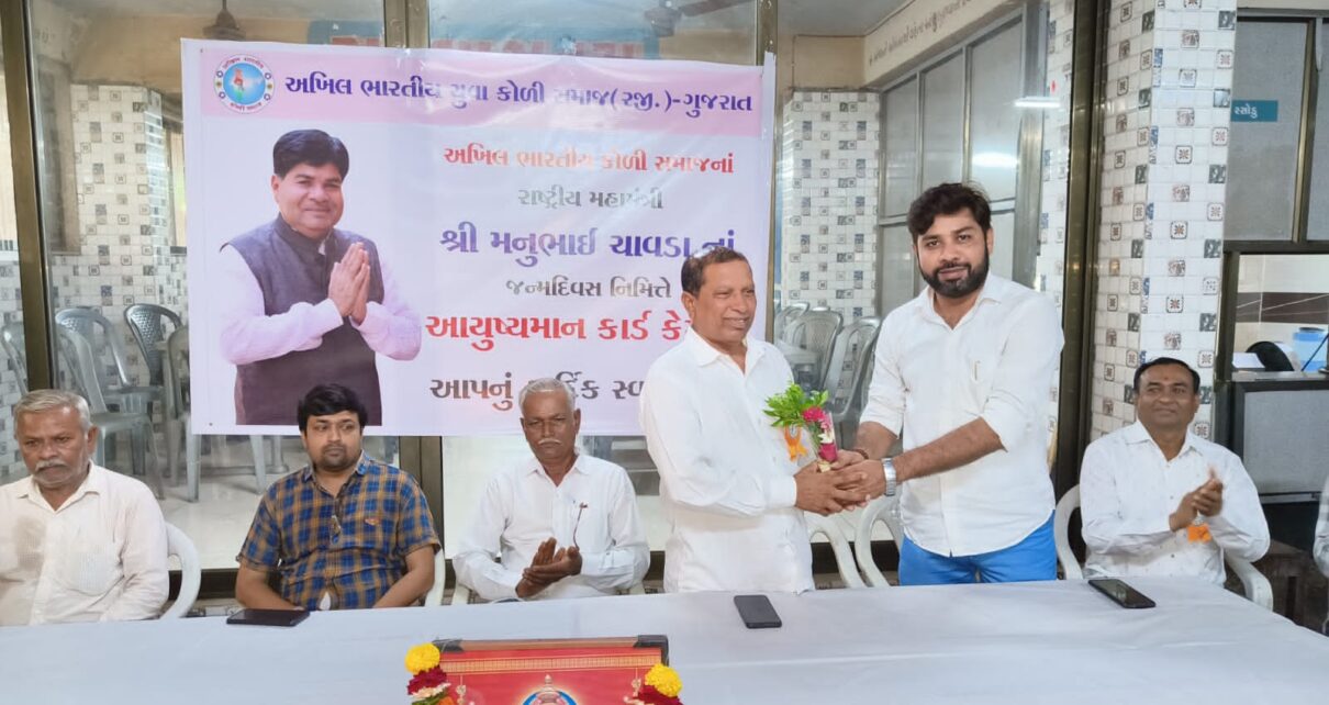 તા .૦૩ / ૦૭ / ૨૦૨૨ ને રવિવાર ના રોજ સુરત ખાતે આવેલી નાલંદા વિદ્યાલયમાં અખિલ ભારતીય કોળી સમાજ ( રજી . ) – ન્યુ દિલ્હીના રાષ્ટ્રીય મહામંત્રીશ્રી મનુભાઈ ચાવડાના ૬૧ માં જન્મદિન નિમિત્તે આયુષ્યમાન કાર્ડ કેમ્પનું આયોજન કરવામાં આવેલ હતું . જેમાં અતિથી વિશેષ તરીકે જાલમભાઇ મકવાણા ( પ્રદેશ મંત્રી ) , માવજીભાઈ ધાપા ( સુરત શહેર પ્રમુખ ) અને દિવ્યેશભાઈ ચાવડા ( પ્રદેશ યુવા અધ્યક્ષ ) , લક્ષ્મીકાંત પટેલ ( દક્ષિણ ઝોન પ્રભારી ) તેમજ રાજેશભાઈ જોળિયા ( ચેરમેન – આરોગ્ય સમિતિ ) ખાસ ઉપસ્થિત રહ્યા હતા . જેમાં દિવ્યેશભાઈ એ આવનારા સમય માં ગુજરાતના એક – એક કોળી સમાજના વ્યક્તિને આયુષ્માન કાર્ડ કઢાવી આપવાનો સંકલ્પ લીધો હતો.આ કાર્યક્રમમાં અંદાજે ૨૦૦ જેટલા પરિવારોને આયુષ્માન કાર્ડ કાઢી આપવામાં આવ્યા હતા .