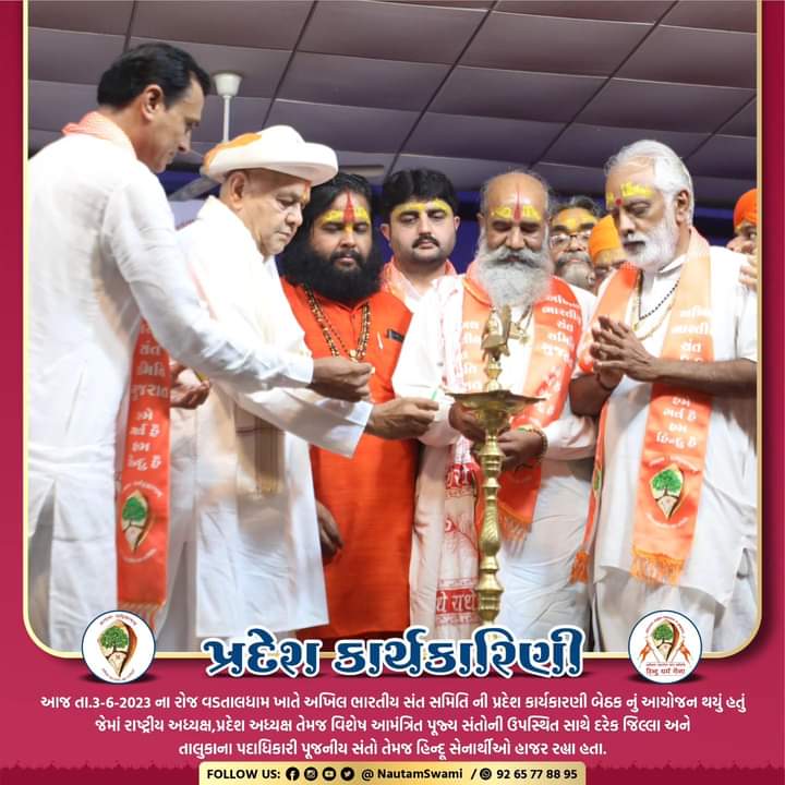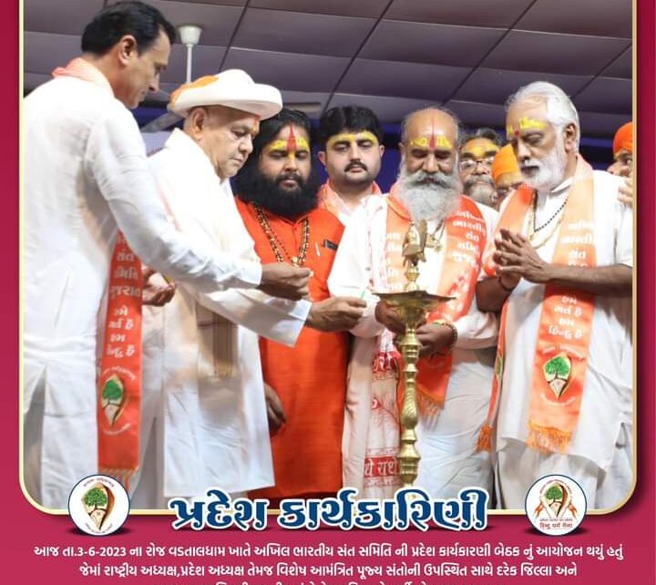 તારીખ 3-6-2023 ના રોજ વડતાલ ધામ ખાતે અખિલ ભારતીય સંત સમિતિની પ્રદેશ કાર્યકારિણી બેઠકનું આયોજન થયું હતું. આ બેઠકમાં રાષ્ટ્રીય અધ્યક્ષ, પ્રદેશ અધ્યક્ષ તેમજ વિશેષ આમંત્રિત પૂજ્ય સંતોની ઉપસ્થિતિ સાથે દરેક જિલ્લા અને તાલુકાના પદાધિકારીઓ સંતો તેમજ હિન્દુ સેનાર્થીઓ હાજર રહ્યા હતા.અખિલ ભારતીય સંત સમિતિ ગુજરાત દ્વારા ગૌરક્ષા,ગંગા રક્ષા,ધર્મરક્ષા અને રાષ્ટ્રરક્ષા માટે હિન્દુ ધર્મ સેનાનું તારીખ 03/01/2021 ના રોજ નિર્માણ કરવામાં આવેલ. આ સેના હિન્દુ ધર્મ માટે ખૂબ જ કાર્યરત હોય અને રાષ્ટ્રપ્રેમી હોય ત્યારે બોટાદ જિલ્લામાં હિન્દુ ધર્મ સેનાના દરેક હોદ્દેદારોની આ બેઠકમાં નિમણૂક કરવામાં આવેલ હતી. આ સંગઠન બનાવવા પાછળ પૂજ્ય વિસામણ બાપુ ની જગ્યા પાળીયાદ ધામના અખિલ ભારતીય સંત સમિતિના સભ્ય શ્રી પૂજ્ય ભયલુબાપુ નો સિંહ ફાળો હતો.સૌરાષ્ટ્રની પ્રખ્યાત દેહાણની જગ્યા એટલે પૂજ્ય વિસામણબાપુની જગ્યા પાળિયાદ ધામના મહંત શ્રી પરમ પૂજ્ય 1008 મહામંડલેશ્વર શ્રી નિર્મળાબાના  પ્રતીક રૂપે પૂજ્ય ભયલુબાપુએ આ કાર્યક્રમમાં હાજરી આપેલ. હિન્દુ ધર્મ સેનાના બોટાદ જિલ્લાના હોદ્દેદારોની નિમણુંક માં મહત્વની ભૂમિકા ભજવનાર પૂ.ભયલુબાપુ તેમજ નવનિયુક્ત બોટાદ જિલ્લા પ્રમુખ ડો.જીગ્નેશ હડિયલ નું ભારતીય સંત સમિતિના રાષ્ટ્રીય અધ્યક્ષ શ્રી જગદગુરુ સપ્તમ કુબેરાચાર્ય પરમ પૂજ્ય અવીચલેદેવાચાર્યજી તેમજ પ્રદેશ અધ્યક્ષ શ્રી નૌતમ સ્વામી દ્વારા સન્માનિત કરવામાં આવ્યા હતા તેમજ હિન્દુ ધર્મ સેનાના નવનિયુક્ત થયેલ તમામ હોદ્દેદારોને નિમણુંક પત્ર આપી સન્માનિત કરવામાં આવ્યા.પૂજ્ય ભયલુબાપુ દ્વારા હિન્દુ ધર્મ સેનાની ટુંક સમયમાં જ ખૂબ મજબૂત અને પ્રગલ્ભ ટિમ બનાવી પ્રશંસાપાત્ર કાર્ય કરવા બદલ અખિલ ભારતીય સંત સમિતિના પ્રદેશ અધ્યક્ષ નૌતમ સ્વામી દ્વારા અભિનંદન પાઠવવામાં આવ્યા.