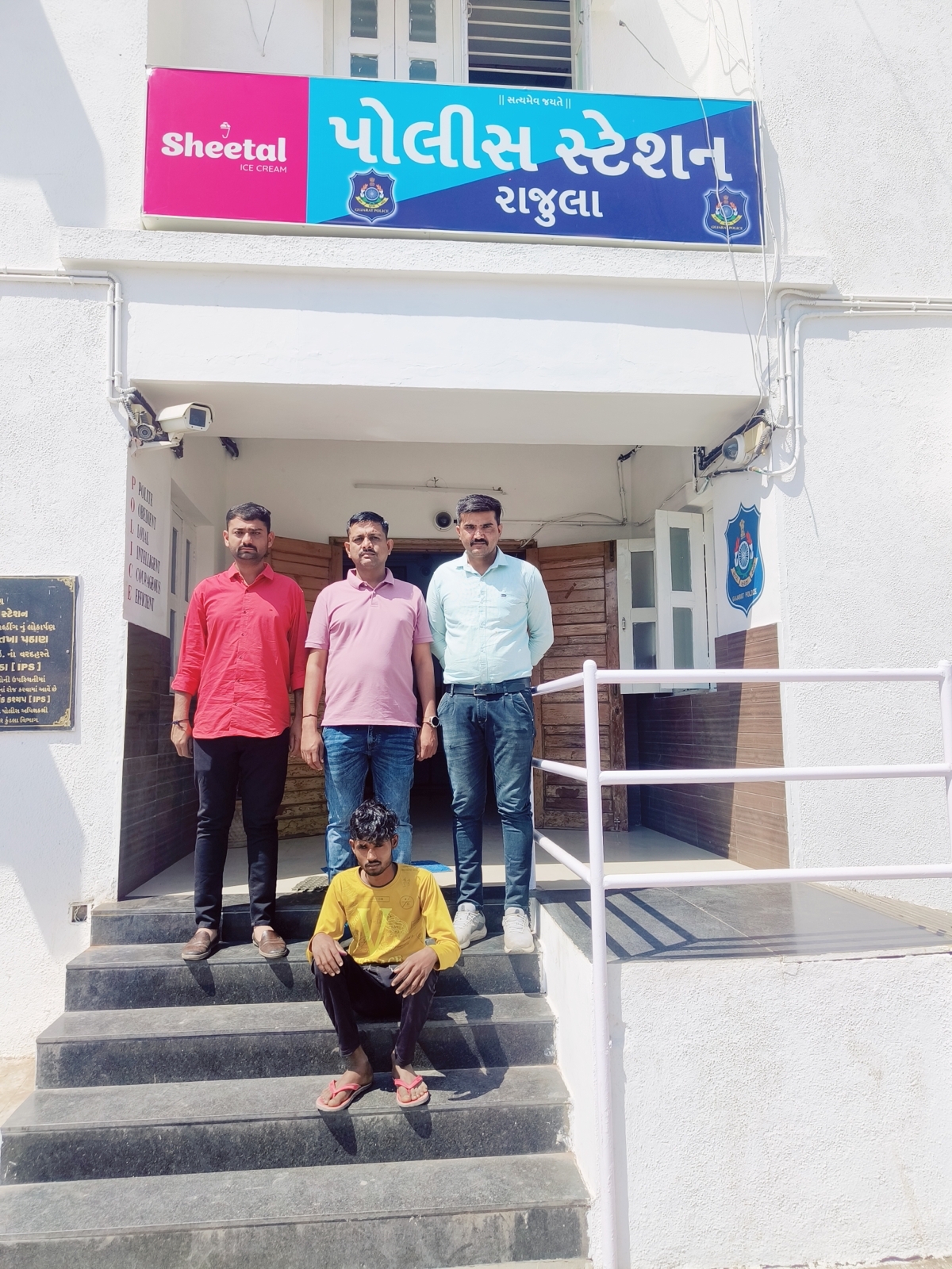 રાજુલા પો.સ્ટે.ના પોલીસ ઇન્સ.શ્રી જે.એન પરમાર સાહેબ તથા સર્વેલન્સ સ્કોર્ડના હેડ કોન્સ. ભીખુભાઇ સોમાતભાઇ ચોવટીયા તથા હેડ કોન્સ. હરપાલસિંહ વિક્રમસિંહ ગોહિલ તથા હેડ.કોન્સ જયભાઇકનુભાઇ ધાધળ તથા પો.કોન્સ. હરેશભાઇ ભાયાભાઇ વાળા દ્વારા કરવામાં આવેલ છે