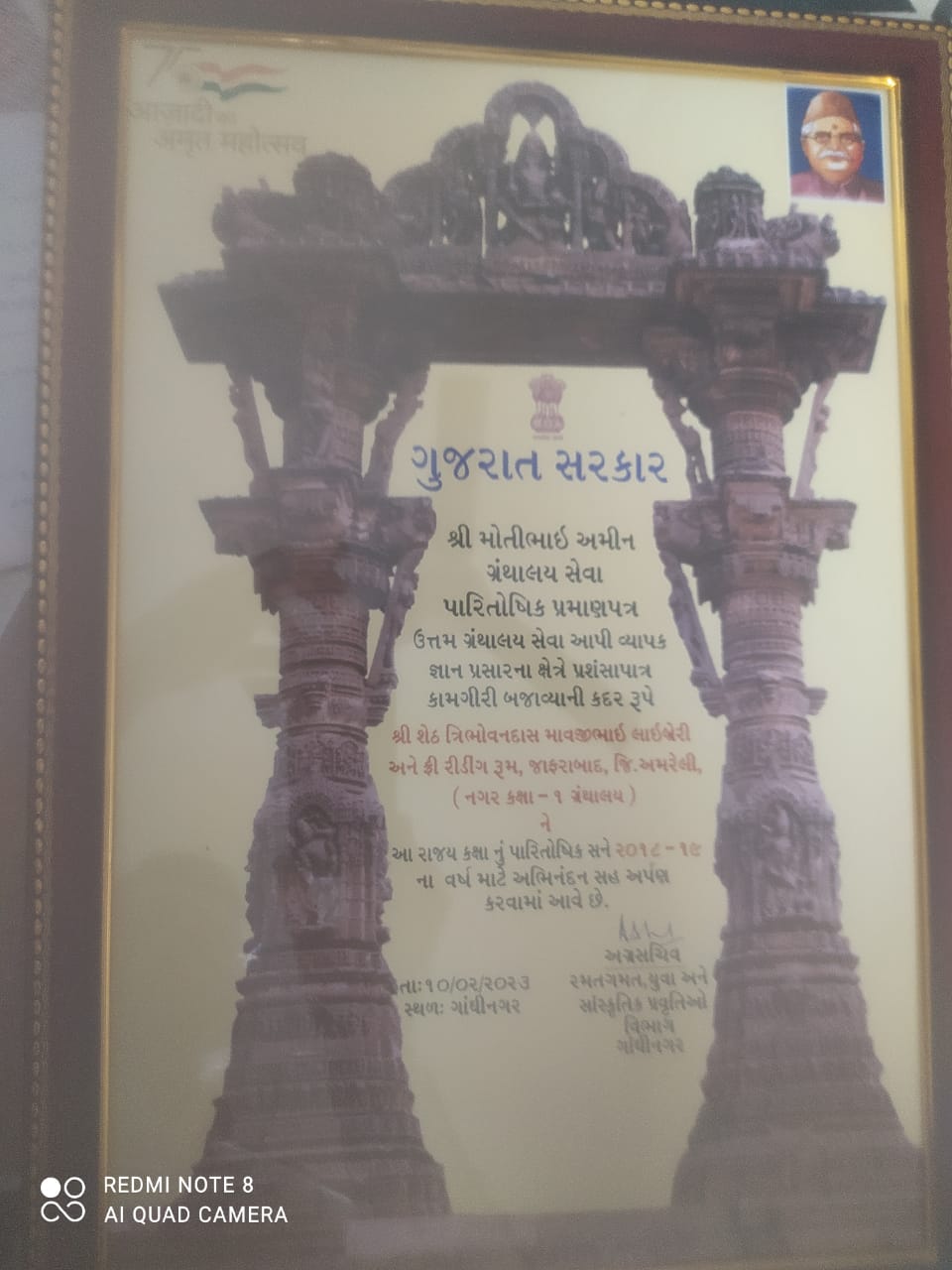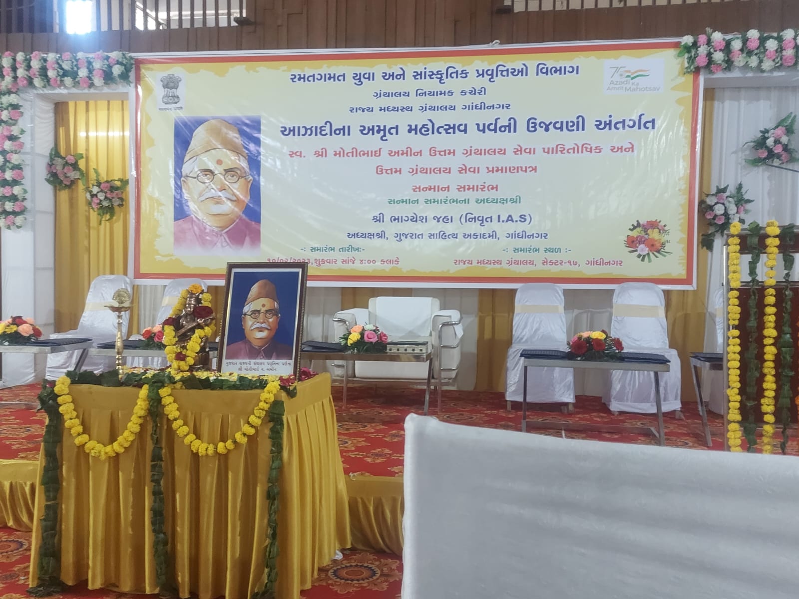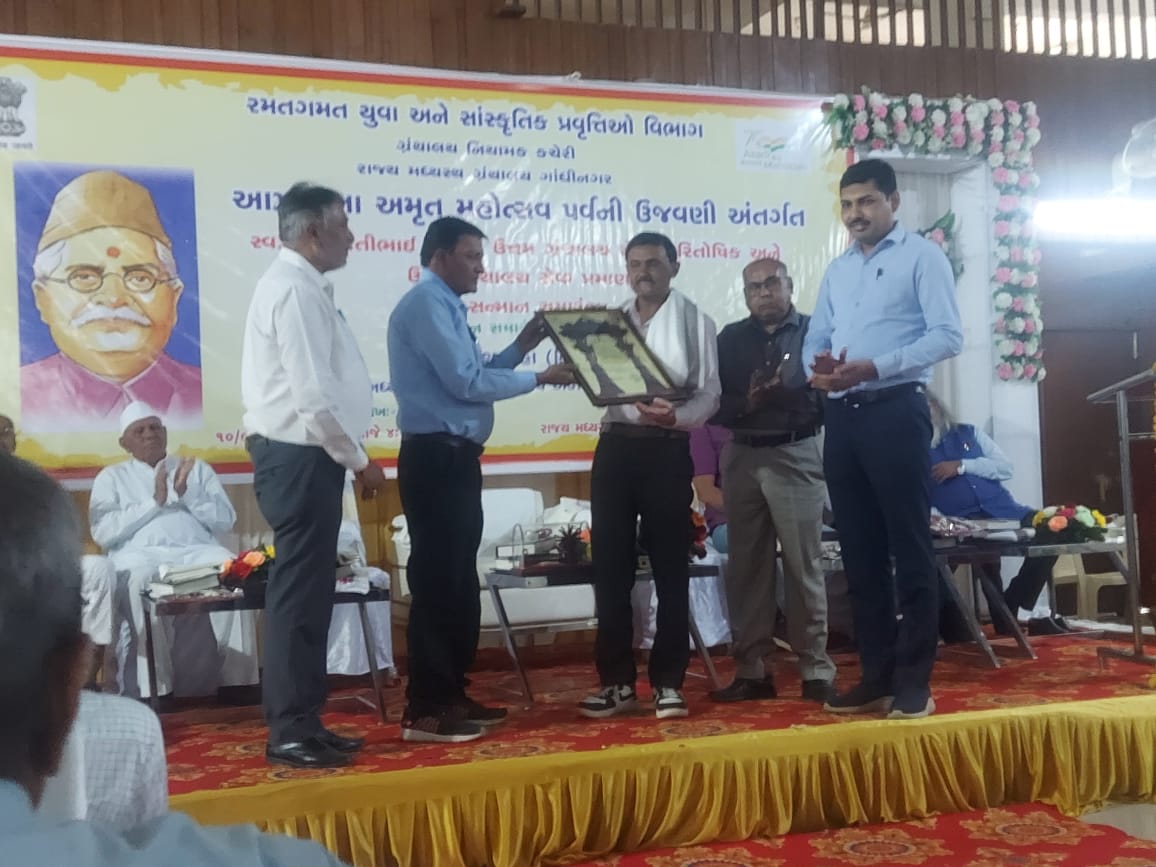 ના રોજ આયોજિત થયેલા જે કાર્યક્રમમાં શેઠ શ્રી ત્રિ. મા લાઈબ્રેરી ને ઉત્તમ ગ્રંથાલય અને ગ્રંથપાલ શ્રી અલારખભાઈ ને ઉત્તમ ગ્રંથપાલ તરીકે એવોર્ડ પસંદગી થયેલ ગુજરાત સાહિત્ય અકાદમીના શ્રી જયેન્દ્ર જાદવ સાહેબ, ઉપ સચિવ શ્રી દિપક પટેલ સાહેબ