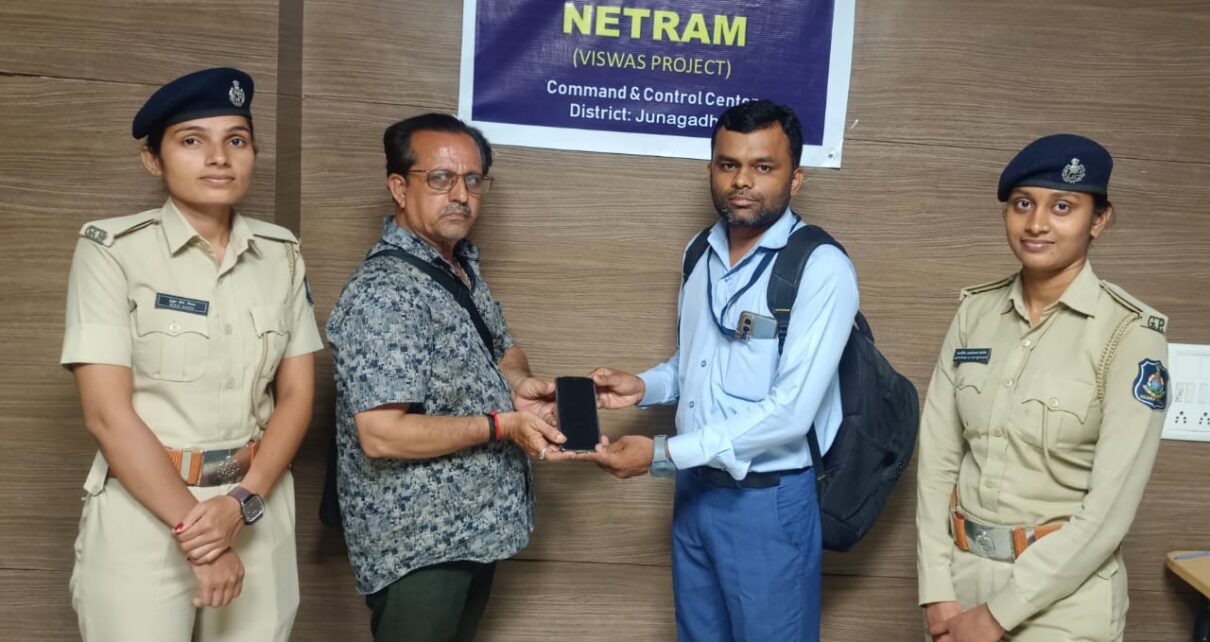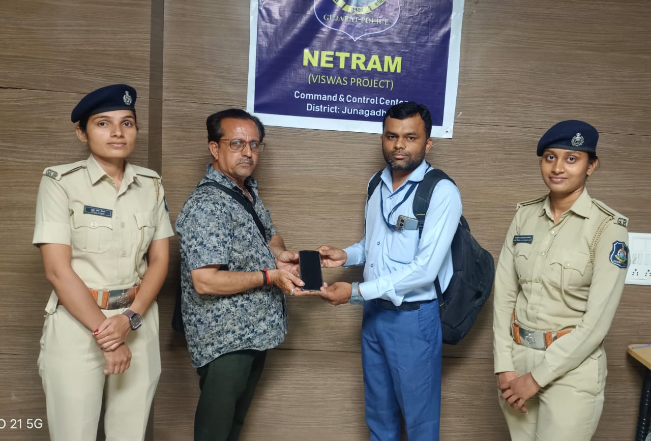 જૂનાગઢ હેડ ક્વા. ડી.વાય.એસ.પી. એ.એસ.પટણીના માર્ગદર્શન હેઠળ નેત્રમ શાખાના (કમાન્ડ & કંટ્રોલ સેન્ટર) પી.એસ.આઇ પી.એચ.મશરૂ, પો.કોન્સ. ચેતન સોલંકી, અંજનાબેન ચવાણ, જાનવીબેન પટોડીયા તથા એન્જીનીયર રેયાઝ અંસારી સહિતની ટીમ દ્વારા જહેમત ઉઠાવી જે સ્થળેથી મોબાઇલ ફોન ખોવાયેલ હતો તે સ્થળના વિશ્વાસ પ્રોજેક્ટ અંતર્ગત ઇન્સ્ટોલ કરવામાં આવેલ હતા. ફૂટેજ ચેક કરતા જણાયેલ કે ૧ વ્યક્તિને આ મોબાઇલ ફોન મળેલ છે, નેત્રમ શાખાના પોલીસ સ્ટાફ દ્રારા તે વ્યક્તિને શોધી પૂછ પરછ કરતા તેમણે જણાવેલ કે મોબાઇલ ફોન સ્વીચ ઓફ થઇ ગયેલ હોય અને તે મોબાઇલ ફોનનુ ચાર્જર તેમની પાસે ના હોય જેથી ચાર્જ થઇ શકેલ નહી અને કોન્ટેક્ટ થઇ શકેલ નહી તેવું જણાવ્યું હતું. આમ ગણતરીની કલાકોમાં અશોકભાઇ છબીલભાઇ ગઢીયાનો રૂ.૧૨,૦૦૦ની કિંમતનો મોબાઇલ ફોન નેત્રમ શાખા દ્રારા શોધી આપ્યો હતો.
