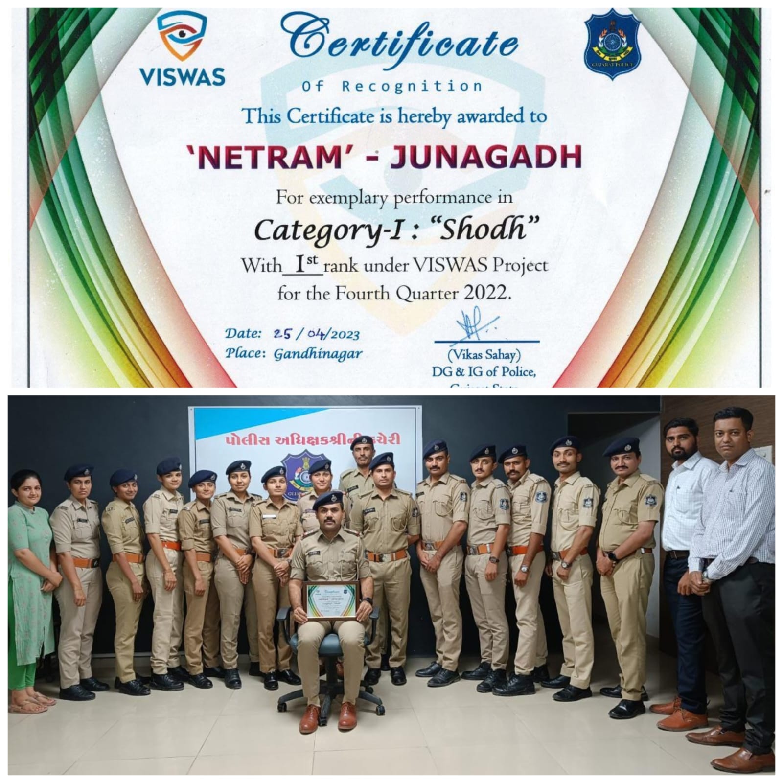 _જૂનાગઢ જીલ્લા પોલીસ અધિક્ષકની કચેરી ખાતે કાર્યરત નેત્રમ શાખા દ્રારા માહે ૧૦/૨૦૨૨ થી માહે ૧૨/૨૦૨૨ દરમ્યાન સીસીટીવી કેમેરાનો ઉપયોગ કરી બનાવનો ભેદ ઉકેલવામાં ડી.જી.પી. શ્રી વિકાસ સહાય સાહેબના હસ્તે એવોર્ડ મેળવી સમગ્ર ગુજરાત રાજ્યમાં પ્રથમ નંબર મેળવેલ અને જૂનાગઢ પોલીસનુ ગૌરવ વધારતા* નેત્રમ શાખાના પી.એસ.આઇ. પી.એચ.મશરૂ અને તેમની સમગ્ર ટીમને જૂનાગઢ રેંજના આઈજીપી શ્રી મયંકસિંહ ચાવડા, જૂનાગઢ જીલ્લા પોલીસ વડા ડો. કરણરાજ વાઘેલા તથા જૂનાગઢ હેડ ક્વા. ડી.વાય.એસ.પી. એ.એસ.પટણી, જૂનાગઢ ડીવીઝનના ડી.વાય.એસ.પી. એચ.ડી.ધાંધલીયા, કેશોદ ડી.વાય.એસ.પી. બી.સી.ઠક્કર તથા માંગરોળ ડીવીઝનના ડી.વાય.એસ.પી. ડી.વી.કોડીયાતર દ્રારા પણ અભિનંદન આપવામાં આવેલ છે….*_