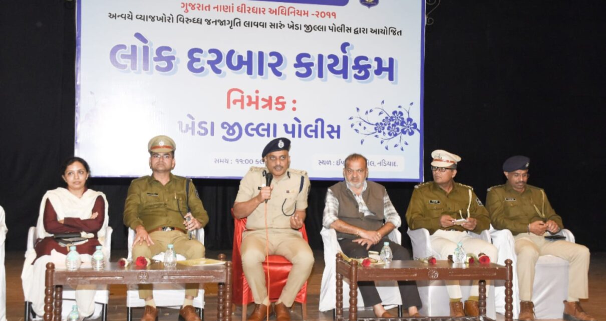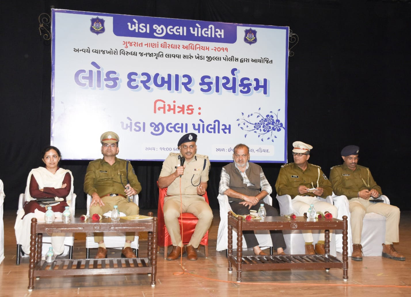 ગુજરાત નાણાં ધિરનાર અધિનિયમ -૨૦૧૧ અન્વયે વ્યાજખોરી વિરૂદ્ધ જનજાગૃતિ લાવવા સારું ખેડા જિલ્લા પોલીસ દ્વારા અમદાવાદ પોલીસ આઇજીપી ચંદ્રસેકરની મુખ્ય ઉપસ્થિતિમાં જનસંપર્ક સભા – લોક દરબાર કાર્યક્રમ ઇપકોવાલા હોલ નડિયાદ ખાતે યોજાયો. આ કાર્યક્રમમાં ઉપસ્થિત લોકોના વિવિધ પ્રશ્નોને સાંભળી નાણાં ધિરાણ પ્રવૃતિઓ માટે કાયદાકીય જોગવાઈઓ અને સામાજિક પરિબળોની મુક્ત ચર્ચા કરવામાં આવી. જેમાં જિલ્લા પોલીસ અધિક્ષક રાજેશ ગઢીયા દ્વારા ગેરકાયદેસર વ્યાજ પ્રવૃત્તિઓ પર કકડ કાર્યવાહી કરવાની ખાતરી આપી.
