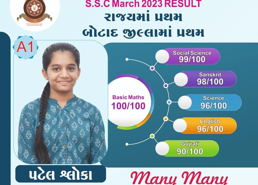 સૌરાષ્ટ્ર ની જગ વિખ્યાત દેહાણ પરંપરા ની પરમ પૂજ્ય શ્રી વિસામણ બાપુ ની જગ્યા વિહળધામ પાળીયાદ સંચાલીત શ્રી વિહળ ઇન્ટરનેશનલ વિદ્યાપીઠ સ્કુલ નું આજ રોજ તા.૨૫/૫/૨૦૨૩ ને ગુરુવાર ના રોજ SSC માર્ચ 2023 નુ પરિણામ જાહેર થયેલ જેમાં શ્રી વિહળ ઇન્ટરનેશનલ વિદ્યાપીઠ ની વિધાર્થીની પટેલ શ્લોકા પીન્કેશભાઈ A1 ગ્રેડ સાથે બીઝીક ગણિત મા 100/100 તથા 99.99 PR સાથે સમગ્ર ગુજરાત રાજ્ય અને બોટાદ જિલ્લા મા પ્રથમ અને જેમણે શાળા તથા પરીવાર નું નામ રોશન કરેલ છે…તેમજ આ શ્રી વિહળ ઇન્ટરનેશનલ વિધાપીઠ મા ધોરણ 10 મા અભ્યાસ કરતા અન્ય ત્રણ વિધાર્થીઓ ચાવડા પ્રિન્સ 99.91 PR À1 ગ્રેડ સાથે બોટાદ જિલ્લા મા તૃતીય , વાઘેલા તીર્થ 99.69 PR A1 ગ્રેડ અને રાઠોડ માનસ 99.33 PR À1 ગ્રેડ સાથે સર્વ શ્રેષ્ઠ પરીણામ પ્રાપ્ત કર્યું છે…