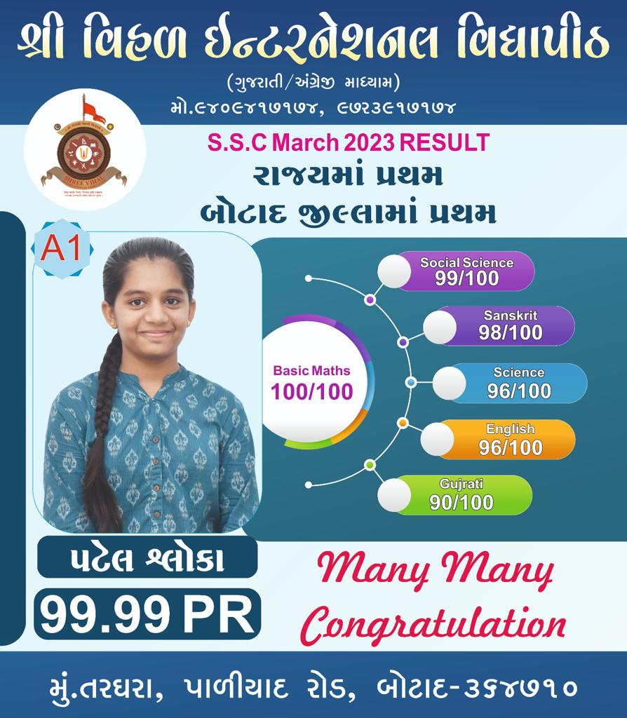 સૌરાષ્ટ્ર ની જગ વિખ્યાત દેહાણ પરંપરા ની પરમ પૂજ્ય શ્રી વિસામણ બાપુ ની જગ્યા વિહળધામ પાળીયાદ સંચાલીત શ્રી વિહળ ઇન્ટરનેશનલ વિદ્યાપીઠ સ્કુલ નું આજ રોજ તા.૨૫/૫/૨૦૨૩ ને ગુરુવાર ના રોજ SSC માર્ચ 2023 નુ પરિણામ જાહેર થયેલ જેમાં શ્રી વિહળ ઇન્ટરનેશનલ વિદ્યાપીઠ ની વિધાર્થીની પટેલ શ્લોકા પીન્કેશભાઈ A1 ગ્રેડ સાથે બીઝીક ગણિત મા 100/100 તથા 99.99 PR સાથે સમગ્ર ગુજરાત રાજ્ય અને બોટાદ જિલ્લા મા પ્રથમ અને જેમણે શાળા તથા પરીવાર નું નામ રોશન કરેલ છે…તેમજ આ શ્રી વિહળ ઇન્ટરનેશનલ વિધાપીઠ મા ધોરણ 10 મા અભ્યાસ કરતા અન્ય ત્રણ વિધાર્થીઓ ચાવડા પ્રિન્સ 99.91 PR À1 ગ્રેડ સાથે બોટાદ જિલ્લા મા તૃતીય , વાઘેલા તીર્થ 99.69 PR A1 ગ્રેડ અને રાઠોડ માનસ 99.33 PR À1 ગ્રેડ સાથે સર્વ શ્રેષ્ઠ પરીણામ પ્રાપ્ત કર્યું છે…