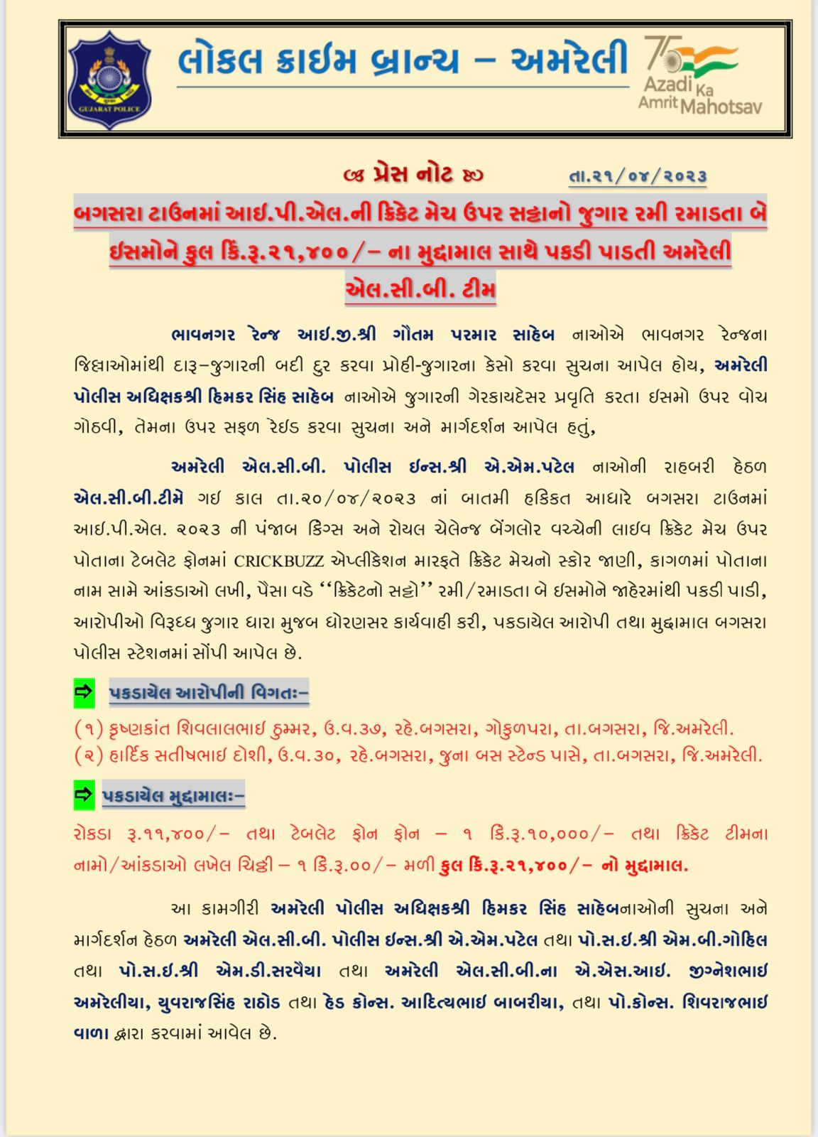 એલ.સી.બી.ટીમે ગઇ કાલ તા.૨૦/૦૪/૨૦૨૩ નાં બાતમી હકિકત આધારે બગસરા ટાઉનમાં આઇ.પી.એલ. ૨૦૨૩ ની પંજાબ કિંગ્સ અને રોયલ ચેલેન્જ બેંગલોર વચ્ચેની લાઇવ ક્રિકેટ મેચ ઉપર પોતાના ટેબલેટ ફોનમાં CRICKBUZZ એપ્લીકેશન મારફતે ક્રિકેટ મેચનો સ્કોર જાણી, કાગળમાં પોતાના નામ સામે આંકડાઓ લખી, પૈસા વડે ‘ક્રિકેટનો સટ્ટો’ રમી/રમાડતા બે ઇસમોને જાહેરમાંથી પકડી પાડી, આરોપીઓ વિરૂધ્ધ જુગાર ધારા મુજબ ધોરણસર કાર્યવાહી કરી, પકડાયેલ આરોપી તથા મુદ્દામાલ બગસરા પોલીસ સ્ટેશનમાં સોંપી આપેલ છે.