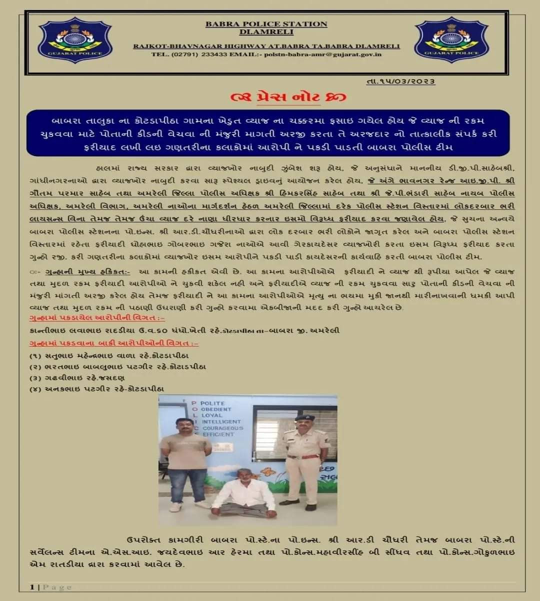 હાલમાં રાજ્ય સરકાર દ્વારા વ્યાજખોર નાબૂદી ઝુંબેશ શરૂ હોય, જે અનુસંધાને માનનીય ડી.જી.પી.સાહેબશ્રી, ગાંધીનગરનાઓ દ્વારા વ્યાજખોર નાબુદી કરવા સારૂ સ્પેશ્યલ ડ્રાઇવનું આયોજન કરેલ હોય, જે અંગે ભાવનગર રેન્જ આઇજીપ, શ્રી ગૌતમ પરમાર સાહેબ તથા અમરેલી જિલ્લા પોલીસ અધિક્ષક શ્રી દિનકરામ સાહેબ તથા શ્રી કે.પી.નારી સાહેબ નાયબ પોલીસ અધિક્ષક, અમરેલી વિભાગ અમરેલી નાઓના માર્ગદર્શન હેઠળ અમરલી જિનામાં દરેક પોલીસ સ્ટેશન વિસ્તારમાં લોકદરબાર ભરી લાયસન્સ વિના તેમ તેમજ ઉંચા વ્યાજ દરે નાણા ધીરધાર કરનાર ઇસમો વિરૂધ ફરીયા કરવા જાવેલ હોય, જે સૂચના અન્વર્ય બાબરા પોલીસ સ્ટેશનના પો.ઇન્સ.શ્રી આર.ડી.ચૌધરીના દ્વારા લોક દરબાર ભરો લોકોને જાગૃત કરત અને બાબરા પોલીસ સ્ટેશન વિસ્તારમાં રહેતા કરીયાદી ઘોટાભાઇ ગોબરભાઇ ગજેરા નાઓએ આવી ગેરકાયદેસર વ્યાજખોરી કરતા ઇસમ વિરૂધ્ધ ફરીયા કરતા ગુન્હો રજૂ કરી ગણતરીના કલાકોમાં વ્યાખોર ઇસમ આરોપીને પકડી પાડી કાયદેસરની કાર્યવાહિ કરતી બાબરા પોલીસ ટીમ.