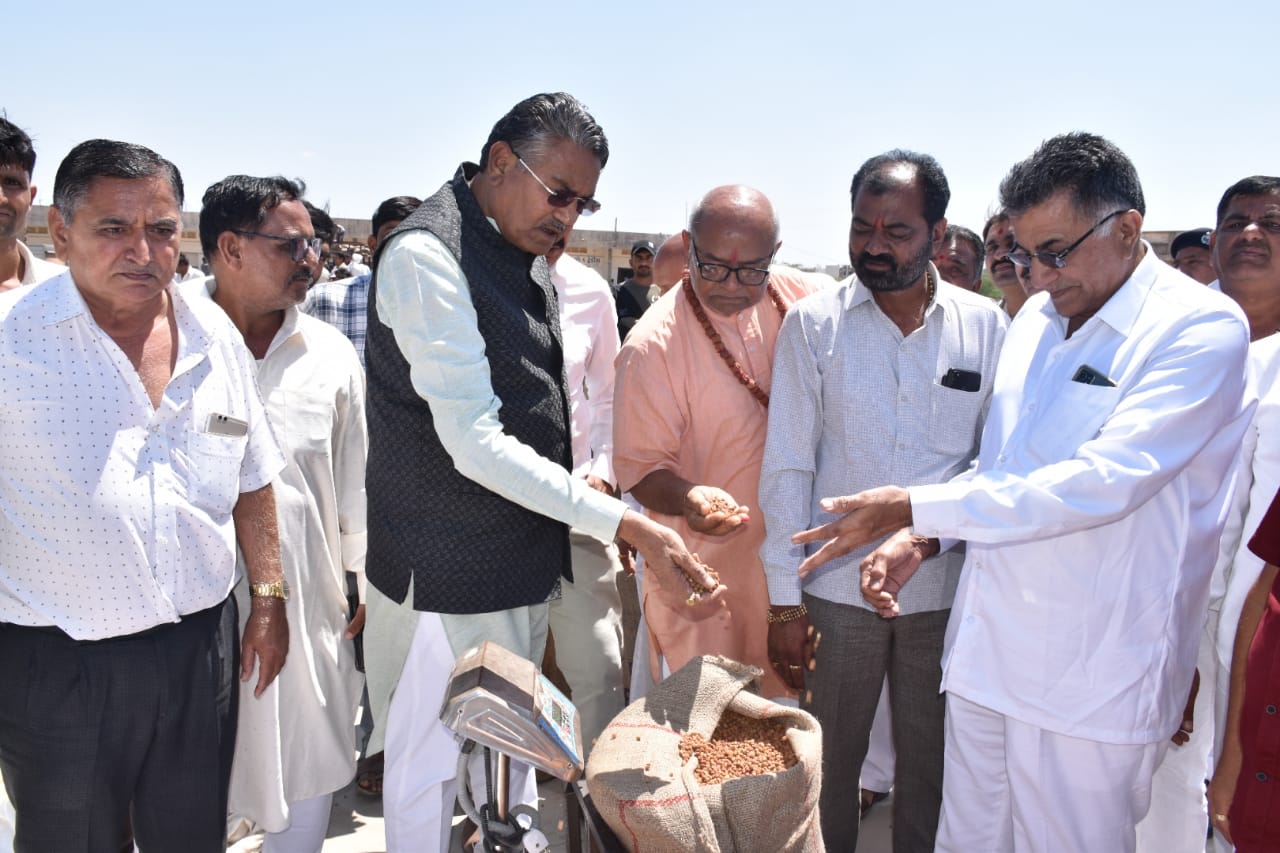 મંત્રીશ્રીએ એ.પી.એમ.સી. ખાતે ચાલી રહેલી ચણાની ખરીદી બાબતે ખેડૂતો સાથે વાર્તાલાપ કર્યો હતો.