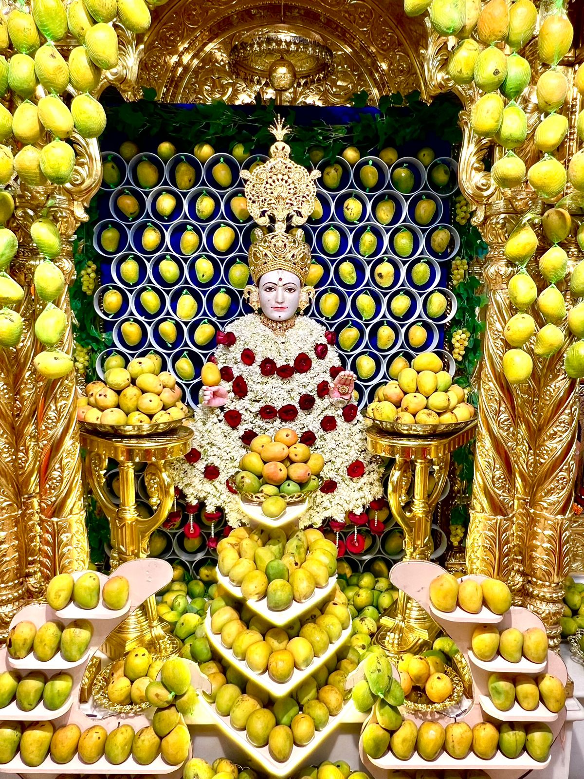 સુગંધથી મઘમઘતી કેરીઓનો અનોખો અને આકર્ષક કલાત્મક મનોરમ્ય શણગાર કરવામાં આવ્યો હતો. શ્રી સ્વામિનારાયણ ભગવાન – ઘનશ્યામ મહારાજ આદિ મૂર્તિઓની ચારેબાજુ લટકતી કેરીઓના અનોખો શણગાર કરવામાં આવ્યો હતો. તો સિંહાસનની આગળ જાતજાતની અને ભાતભાતની મીઠી અને મધુર કેરીઓનો પ્રસાદરૂપે આમ્રોત્સવ મનાવવામાં આવ્યો હતો.