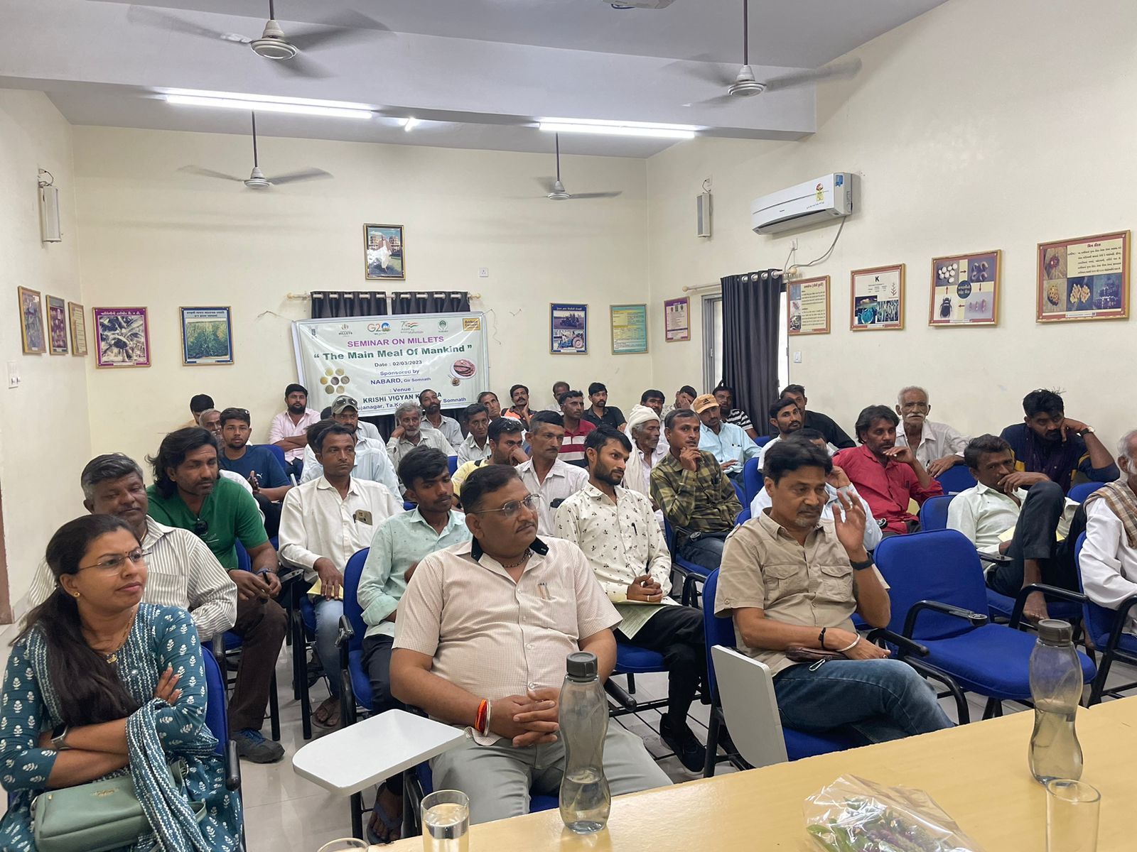 આ તકે મહાનુભાવોનું મિલેટની ડૂંડીનો ઉપયોગ કરીને બનાવાયેલા પુષ્પગુચ્છથી સ્વાગત કરવામાં આવ્યુ હતું. ડૉ. કે. ડી. મુંગરાએ ખૂબ જ સરળ ભાષામાં મિલેટની વૈજ્ઞાનિક ખેતી પદ્ધતિ તેમજ આવનારા સમયમાં મિલેટની ખેતી અને મૂલ્યવર્ધન ક્ષેત્રે રહેલી તકો વિશે ઉંડાણપૂર્વકનું જ્ઞાન પીરસ્યું હતું. કેવીકેના ડૉ. હંસાબેન પટેલ તથા શ્રી રમેશભાઈ રાઠોડ દ્વારા પણ ગીર સોમનાથ જિલ્લામાં મિલેટનું વાવેતર, વેચાણ વ્યવસ્થાપન, મિલેટનું માનવ આહારમાં મહત્વ વગેરે જેવા વિષય પર ખેડૂતોને માહિતી આપવામાં આવી હતી. આ સેમીનારનું સંચાલન વિષય નિષ્ણાત પૂજાબેન નકુમ દ્વારા કરવામાં આવ્યું હતું. કાર્યક્રમ બાદ ઉપસ્થિત સૌએ મિલેટ આધારિત ભોજન લઈ ખરા અર્થમાં મિલેટ વર્ષની ઉજવણી કરી હતી.