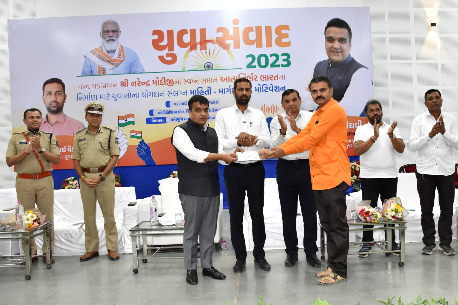 જિલ્લા પોલીસ, જિલ્લા પંચાયત, નગરપાલિકા, જિલ્લા ભાજપ, પત્રકારશ્રીઓ સહિતની ટીમ દ્વારા વિવિધ મેમેન્ટો આપી ગૃહ અને રમતગમત રાજયમંત્રીશ્રી હર્ષ સંઘવીને સન્માનિત કરવામાં આવ્યા હતા.