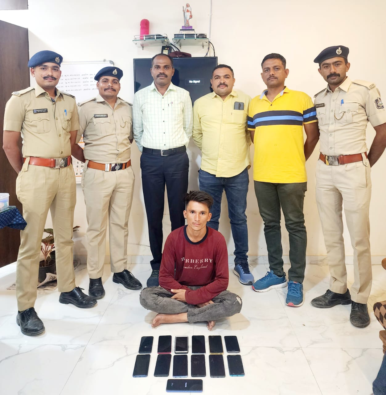 નાં રોજ ઉપરોક્ત ગુનાને અંજામ આપી નાસી ગયેલ આરોપીની તપાસ કરનાર શ્રી બી.એમ.વાળા, અનાર્મ હેડ કોન્સ.નાઓએ ચોરી થયેલ સ્થળ નજીકના સી.સી.ટી.વી કેમરાના ફુટેઝ તેમજ ખાનગી બાતમીદારો મારફતે આરોપી અંગે ચોકકસ બાતમી મેળવી, ઉપરોક્ત ચોરીના ગુનાને અંજામ આપનાર આરોપીને ચોરીમાં ગયેલ મોબાઇલ તથા અન્ય બાર મોબાઇલ મળી કુલ-૧૩ મોબાઇલ સાથે ગણતરીની કલાકોમાં પકડી પાડી મોબાઇલ ચોરીના અનડીટેકટ ગુન્હાનો ગણતરીની કલાકોમાં ભેદ ઉકેલેલ છે.