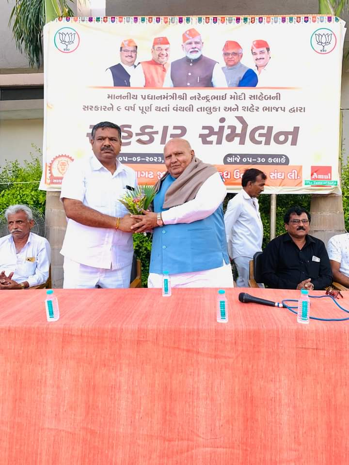 જુનાગઢ જિલ્લાના વંથલી નજીક ખોખરડા ફાટક સ્થિત સાવજ દૂધ સંઘના પટ્ટાગણમાં પ્રધાનમંત્રી નરેન્દ્ર મોદીના નેતૃત્વમાં કેન્દ્ર સરકારના નવ વર્ષ પૂર્ણ થવાના અવસરે તાલુકા અને શહેર ભાજપ દ્વારા આયોજિત “સહકાર સંમેલન”વિસ્તારના સાંસદ રમેશભાઈ ધડુક ની પ્રેરક ઉપસ્થિતિમાં યોજાયો હતો.