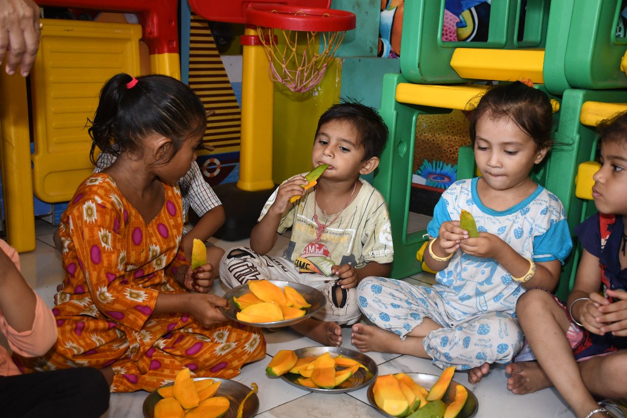 આંગણવાડી કાર્યકર બેહનોએ વ્યવસ્થિત સુધારીને પ્રસાદની કેરીઓ ડિશમાં બાળકોને આરોગવા માટે આપવામાં આવી હતી. ત્યારે નાના ભૂલકાઓ ફળોનો રાજા ગણાતી કેસર કેરીનો સ્વાદ માનવામાં મુગ્ધ થયા હતા. કેરી ખાતા બાળકોની આંખોમાં નિર્દોષ આનંદ અને પ્રસાદ આપનાર પ્રત્યે કૃતજ્ઞતાનો ભાવ સાચા અર્થમાં બાળકમાં ભગવાનનો વાસ છે. તે વાક્ય ની સાક્ષાત અનુભૂતિ કરાવી રહ્યો હતો.