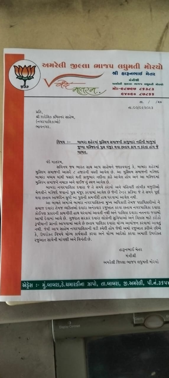 વિષય :- બાબરા શહે૨માં મુસ્લિમ સમાજની કાળુભાર નદીની બાજુમાં જુમ્મા મસ્જિદનો પુલ મંજુર થવા છતાય કામ ન કરતા હોય જે બાબત.