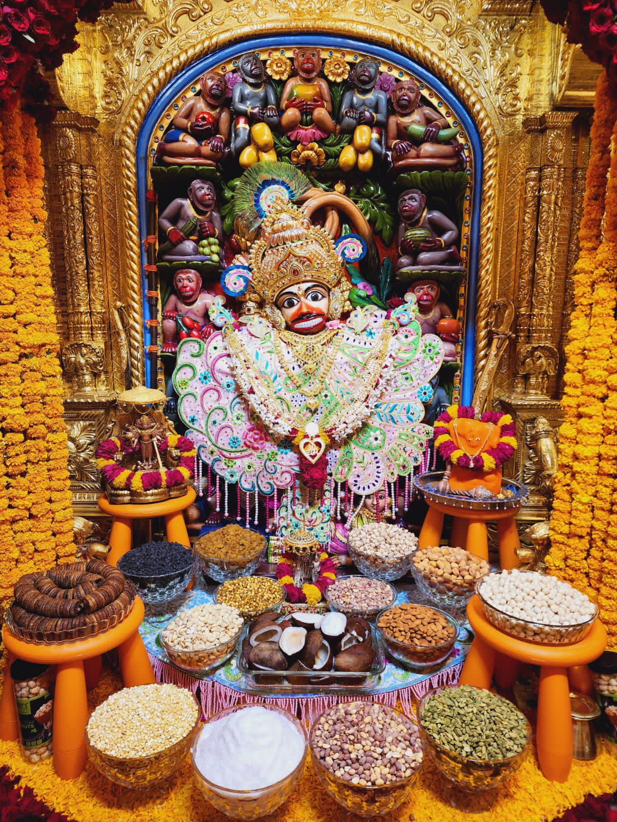 હનુમાનજીદાદા ને ખારેક,કાળી,દ્રાક્ષ,લવિંગ,કાજુ,બદામ,ખજુર વિગેરેનો અન્નકૂટ ધરાવવામા આવ્યો…