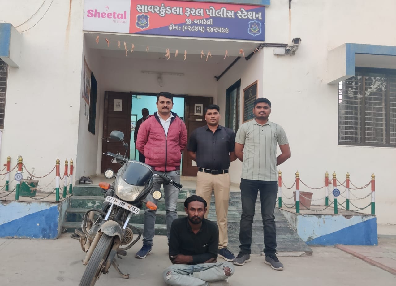 અમરેલી એલ.સી.બી. પો.ઇન્સ. શ્રી એ.એમ.પટેલ નાઓની રાહબરી હેઠળ એલ.સી.બી.ટીમ સાવરકુંડલા રૂરલ પોલીસ સ્ટેશન વિસ્તારમાં પેટ્રોલીંગ દરમ્યાન બાતમી હકિકત આધારે વિજપડી – ઘાંડલા ગામ વચ્ચે આવેલ રેલ્વે સ્ટેશન પાસેથી ચોરીના મોટર સાયકલ સાથે એક ઇસમને પકડી પાડી, પકડાયેલ આરોપી તથા મળી આવેલ મોટર સાયકલ આગળની કાર્યવાહી થવા સાવરકુંડલા રૂરલ પોલીસ સ્ટેશનમાં સોંપી આપેલ છે.