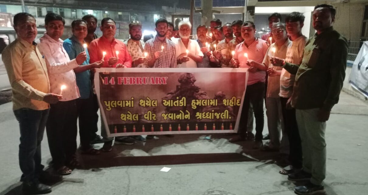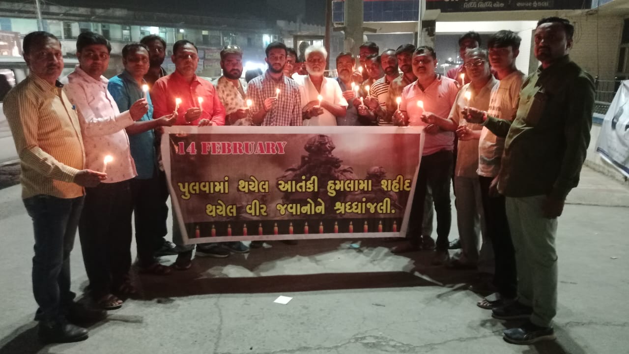 ગઈકાલે સાવરકુંડલા શહેરમાં આવેલ રિધ્ધી સિધ્ધિનાથ મહાદેવ મંદિર ચોક  ખાતે પુલવામા આતંકી હુમલામાં શહીદ થયેલા વીર  જવાનોને  કેન્ડલ માર્ચ દ્વારા શ્રધ્ધાંજલી અર્પણ કરવામાં આવી હતી.