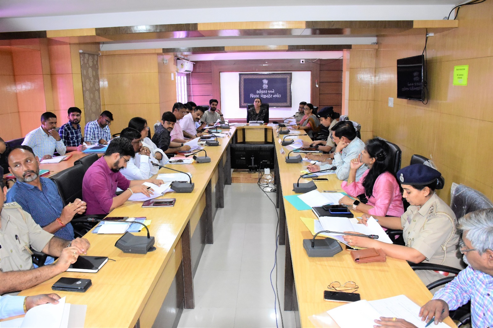 રાજપીપલા, શનિવાર :- નર્મદા જિલ્લા કલેક્ટર કચેરીના સભાખંડમાં આજરોજ જિલ્લા પંચાયત પ્રમુખ શ્રીમતી પર્યુષાબેન વસાવાની વિશેષ ઉપસ્થિતિ અને જિલ્લા કલેક્ટર શ્રીમતી શ્વેતા તેવતિયાના અધ્યક્ષસ્થાને જિલ્લા સંકલન સમિતિની બેઠક યોજાઈ હતી. જનહિતના વિકાસ કામોને અગ્રતા આપી નિયમ અને નિયત સમયમર્યાદામાં કામો પૂર્ણ કરવા તથા લોકપ્રશ્નોનું ત્વરિતપણે નિરાકરણ લાવવા અંગે બેઠકમાં ઉપસ્થિત અધિકારીશ્રીઓને તાકિદ કરી સૂચના આપી હતી.