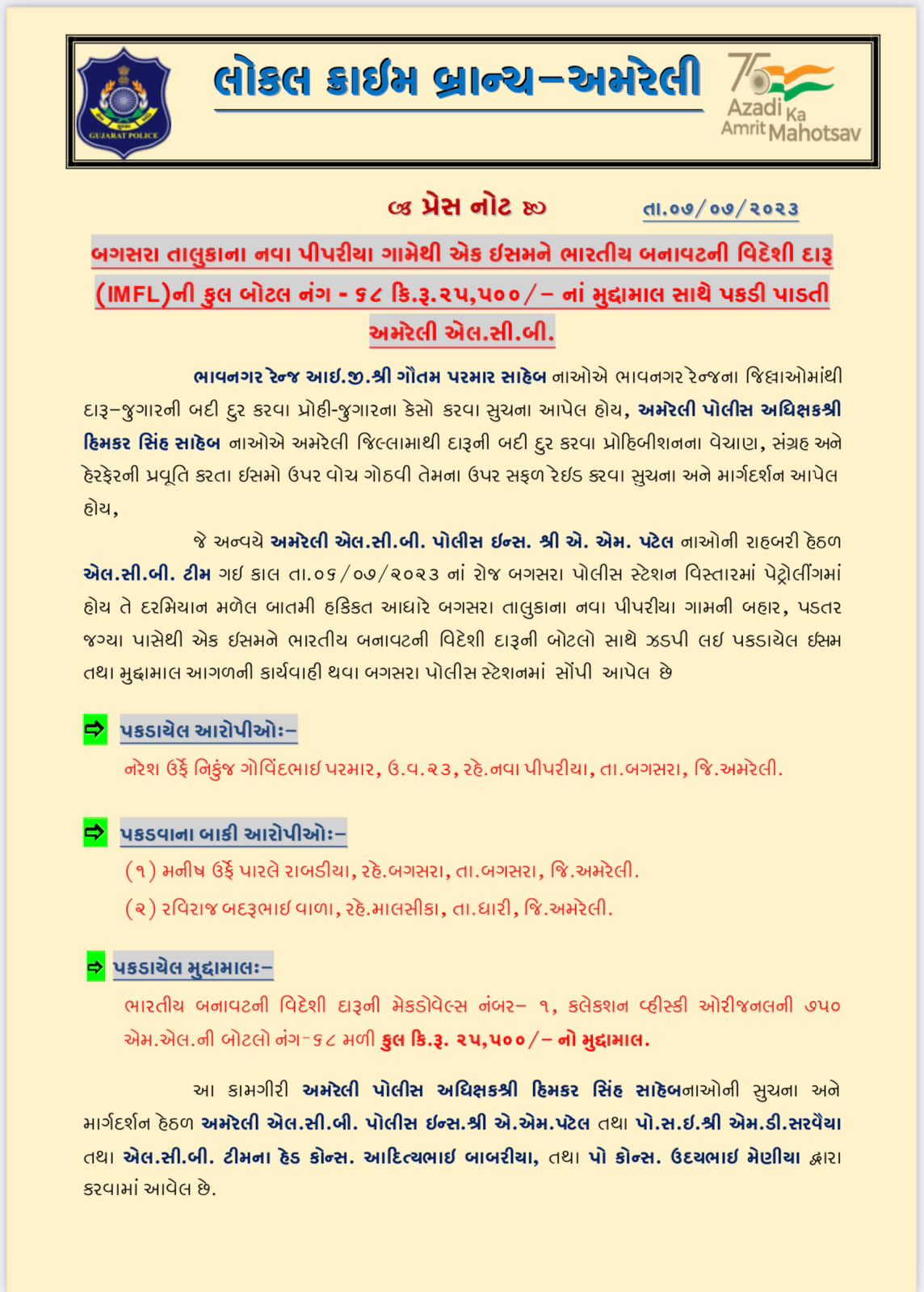 જે અન્વયે અમરેલી એલ.સી.બી. પોલીસ ઇન્સ. શ્રી એ. એમ. પટેલ નાઓની રાહબરી હેઠળ એલ.સી.બી. ટીમ ગઇ કાલ તા.૦૬/૦૭/૨૦૨૩ નાં રોજ બગસરા પોલીસ સ્ટેશન વિસ્તારમાં પેટ્રોલીંગમાં હોય તે દરમિયાન મળેલ બાતમી હકિકત આધારે બગસરા તાલુકાના નવા પીપરીયા ગામની બહાર, પડતર જગ્યા પાસેથી એક ઇસમને ભારતીય બનાવટની વિદેશી દારૂની બોટલો સાથે ઝડપી લઇ પકડાયેલ ઇસમ તથા મુદ્દામાલ આગળની કાર્યવાહી થવા બગસરા પોલીસ સ્ટેશનમાં સોંપી આપેલ છે