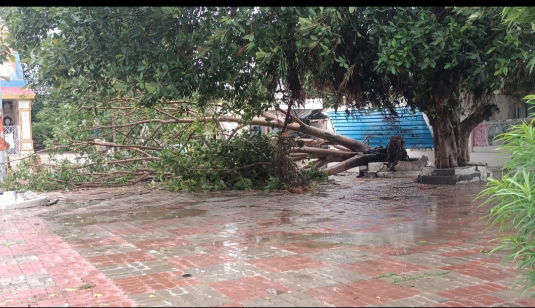 શાપર-વેરાવળ મા બીપરજોય વાવાજોદા ને લઈને સવાર થીજ વરસાદી માહોલ સર્જાયો છે. વાવાજોડા ની પૂર્વ અસર ના કારણકે શહેર મા દીવસભર ભારે પવન ફૂંકાય રહ્યો છે.જેમાં આજરોજ વેરાવળ ની શાન્તિધામ સોસાયટી માઁ આવેલ નીલકંઠ મહાદેવ મંદિર ના પરિસર મા ભારે પવન ફૂંકાવવા ના કારણે એક તોતિંગ વૃક્ષ ધરાસાય થયું હતું.અને ત્યાં કોઈ હાજર ના હોવાને કારણે સદનસીબે કોઈ જાન હાની થય નથી.તેવું સોસાયટી ના સદસ્ય અનિરુદ્ધસિંહ વાઘેલા એક યાદી મા જણાવેલ હતું.