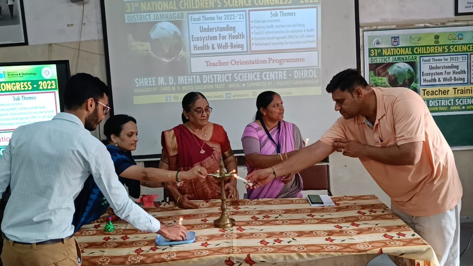 NCSTC-ન્યુ દિલ્હી અને ગુજકોસ્ટ ગાંધીનગરનાં આર્થિક સહયોગથી શ્રી એમ.ડી.મહેતા જિલ્લા વિજ્ઞાનકેન્દ્ર-ધ્રોલ તથા ડી.ઈ.ઓ.કચેરી, ડી.પી.ઈ.ઓ. કચેરી અને નગર પ્રાથમિક શિક્ષણ સમિતિ કચેરી જામનગરનાં સંયુક્ત ઉપક્રમે જામનગર જિલ્લાની પ્રાથમિક અને માધ્યમિક શાળાનાં શિક્ષકો માટે રાષ્ટ્રીય બાળ વિજ્ઞાન પરિષદ-૨૦૨૩ (NCSC-2023) અંતર્ગત “મુખ્ય વિષય : આરોગ્ય અને સુખાકારી માટે ઇકો સિસ્ટમની સમજણ” અંતર્ગત પાંચેય સબથીમો (૧) તમારી ઇકો સિસ્ટમને જાણો, (૨) આરોગ્ય, પોષણ અને સુખાકારીને પ્રોત્સાહન આપવું, (૩) ઇકોસિસ્ટમ અને આરોગ્ય માટે સામાજિક અને સાંસ્કૃતિક પ્રથાઓ, (૪) સ્વ-નિર્ભરતા માટે ઇકોસિસ્ટમ આધારિત અભિગમ, (૫) ઇકોસિસ્ટમ અને આરોગ્ય માટે તકનીકી નવીનીકરણ પર શિક્ષક કાર્યશાળાનું આયોજન કરવામાં આવેલ.