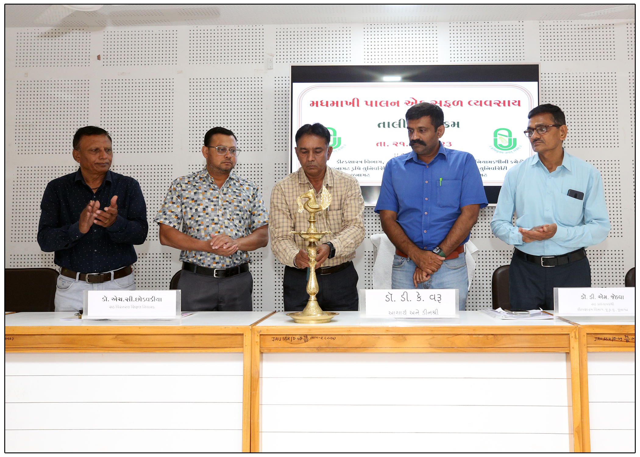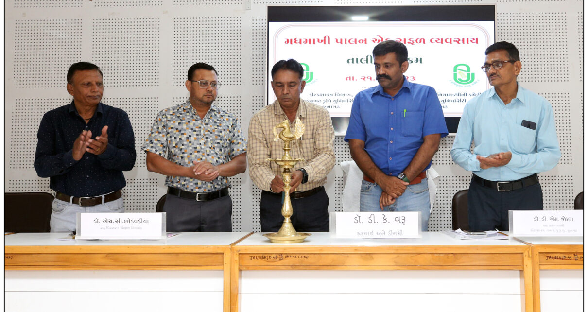 આ પ્રસંગે આ કાર્યક્રમના કોર્ડીનેટરડો.ડી.એમ.જેઠવાએ જણાવ્યું કે,મધમાખી આશરે ચાર કરોડ વર્ષ પહેલા અસ્થિતત્વમાં આવી હોય તેવું માનવામાં આવે છે.મધમાખી અને માનવનોસબંધ ઘણો જુનો છે.કદાચ આદિ માનવે સૌ પ્રથમ મધુર ખોરાક તરીકે મધનો જ ઉપયોગ કર્યો હશે.ભારતમાં૧૮૮૨માં આધુનિક મધમાખીપાલનની શરૂઆત બંગાળથી થઈ હતી.ઈ.સ. ૧૯૩૮માં ભારતના મધમાખીપાલકોએ ઓલ ઈન્ડીયા બીકીપર્સ એશોસિએશન ની સ્થાપના કરી ને ‘ઈન્ડિયન બી જર્નલ’છાપવાનું શરુ કર્યું હતુ. મધમાખીની ૨૦ પ્રજાતિ છે. તેમાંથી ગુજરાતમાં ઈટાલિયન મધમાખીની પ્રજાતિ અપનાવવામાં આવે છે. ડો.એચ.સી.છોડવડીયા એ પ્રાસંગિક ઉદબોધન કર્યુ હતુ. વધુ માં ડો.જી.આર.ગોહીલએ જણાવ્યું કે,હાલ ઘણા ખેડૂતભાઈઓ પુરક વ્યવસાય તરીકે મધમાખીપાલન કરે છે.અને તેમાંથી સારી એવી આવક મેળવે છે.આ તાલિમમાં મધમાખીપાલન દરમ્યાન લેવાની થતી કાળજીઓઅને માવજત, મધમાખીમાં વપરાતા સાધનો અને તેની ઉપયોગીતા,મધપેટીસાચવવાની પદ્ધતિ,તેમાં આવતા રોગ અને જીવાતોનું નિયત્રણ,ખેતી તથા શાકભાજી પાકોમાં ઉત્પાદનમાં પશુપાલનનીઅગત્યતા,મધમાખીપાલનથી મુખ્ય અને ગૌણ ઉત્પાદકો અને મધ કાઢવાની પદ્ધતિ વગેરે વિષયો ઉપર તાલીમ આપવામાં આવી હતી. આ કાર્યકર્મનું સંચાલન ડો.બી.એન.કલસરીયાએ કર્યુ હતુ.