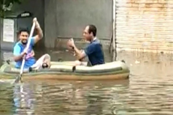અમદાવાદના મણિનગર ખાતે વરસાદમાં લોકોને હોડી ચલાવવાની ફરજ પડી