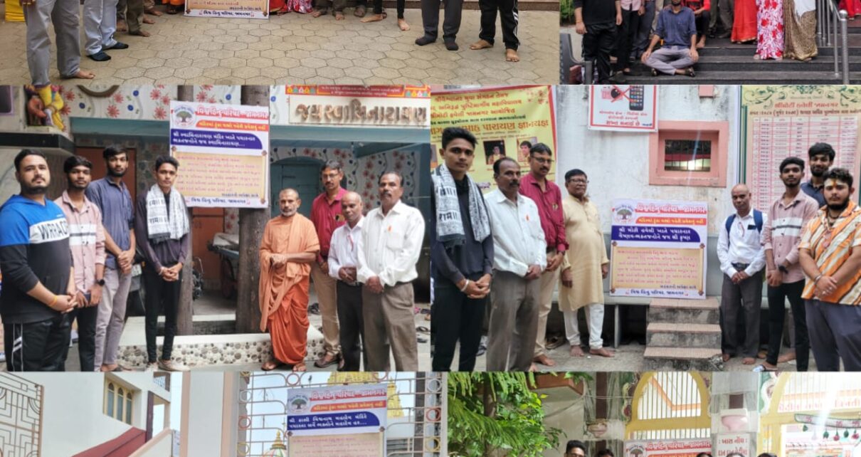 જામનગરના શ્રીકૃષ્ણ પ્રણામી ધર્મની આચાર્ય પીઠ શ્રી 5 નવતનપુરી ધામ- ખીજડા મંદિરે તુલસી શાસ્ત્રીજી અને મંદિરના કર્મચારી સાથે , શ્રી સ્વામિનારાયણ મંદિરે કોઠારી ચત્રભુજ સ્વામી સાથે, શ્રી બાલા હનુમાન સંકીર્તન મંદિરે ટ્રસ્ટી સાથે, મોટી હવેલી ખાતે હરિભાઈ ઘાડીયા, કાશી વિશ્વનાથ મહાદેવ મંદિરે ટ્રસ્ટી સાથે અને અન્નપૂર્ણા મંદિર લાલવાડી સહિતના ધર્મસ્થાનોમાં વિશ્વ હિન્દુ પરિષદ જામનગર વિભાગના અધ્યક્ષ ભરતભાઈ ડાંગરિયા, ઉપાધ્યક્ષ રમેશભાઈ તારાપરા, ઉપાધ્યક્ષ સુભ્રમણયમભાઈ પીલ્લે, મંત્રી હેમતસિંહ જાડેજા, સહ મંત્રી તેમજ ધર્માચાર્ય સંપર્ક સંયોજક સુરેશભાઈ ગોંડલીયા, જિલ્લા પ્રચાર-પ્રસાર વિભાગના સંયોજક કિંજલભાઈ કારસરીયા, માતૃશક્તિ મહિલા વિભાગના પ્રાંત સહસંયોજિકા હીનાબેન અગ્રાવત, પ્રફુલાબેન અગ્રાવત, સ્વરૂપબા જાડેજા, રીનાબેન નાનાણી, બજરંગ દળ ના સહ સંયોજક જીલ બારાઈ, ધ્રુમિલ લંબાટે, નિર્મલ દુધાગરા, આકાશ વાઘેલા, રાજ નારિયા સહિતના અગ્રણી હોદ્દેદારોએ આહવાન કરતા બોર્ડ લગાવ્યા છે.