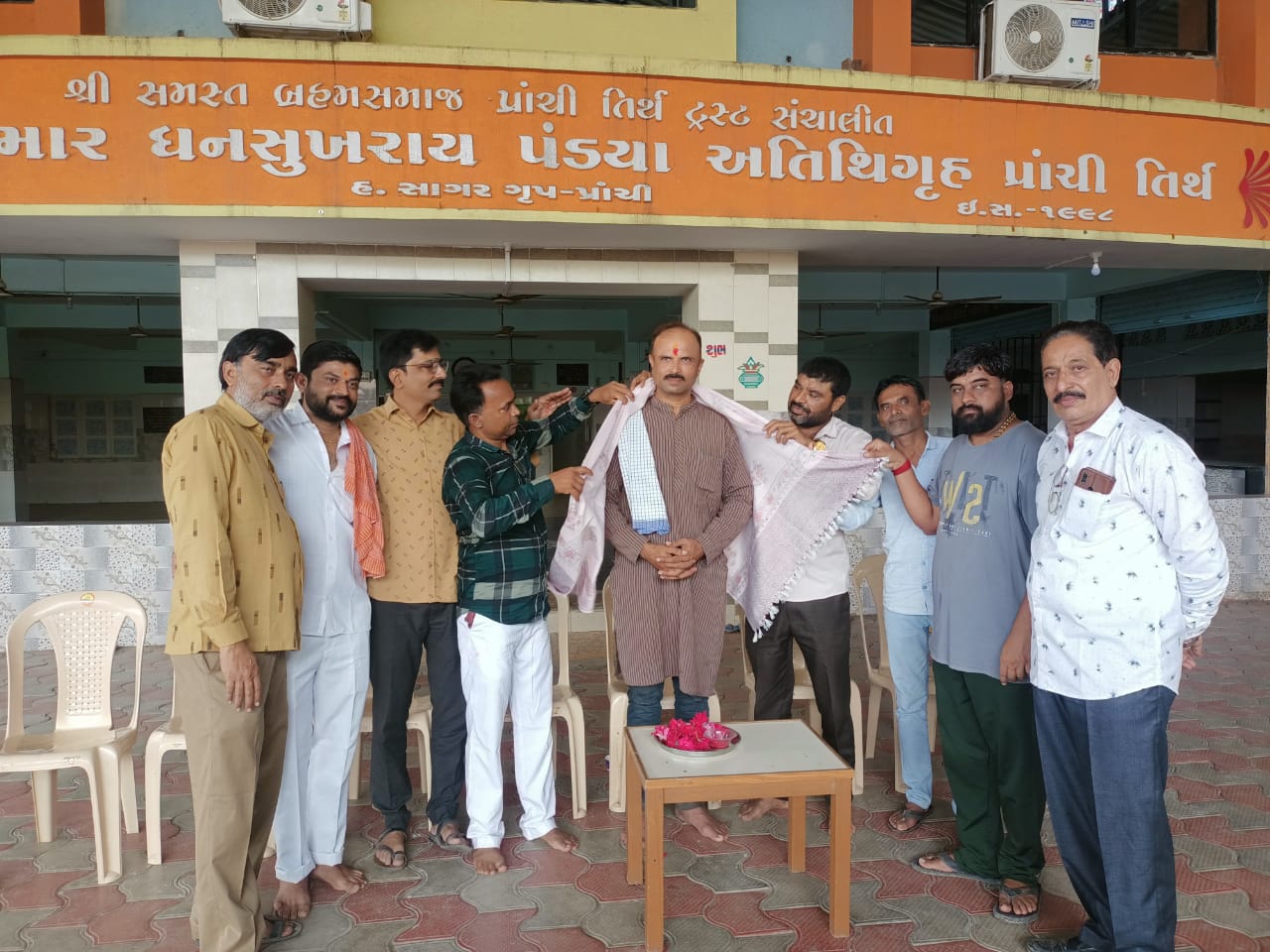 સુત્રાપાડા તાલુકાના પ્રાચી તીર્થ ખાતે આજરોજ બ્રહ્મ સમાજની વંડી ખાતે નિવૃત્ત આર્મી મેન બીએસએફના જવાન રાકેશભાઈ કિરીટભાઈ પંડ્યા નું મેરી મિટી મેરા દેશ કાર્યક્રમ અંતર્ગત સન્માન કરવામાં આવ્યું હતું આ પ્રસંગે સુત્રાપાડા તાલુકાના મામલતદાર કચેરી સ્ટાફ છગનભાઈ વાણવી પ્રાચી ગામના આગેવાન દિનેશભાઈ પઢીયાર ,હર્ષદભાઈ જોશી ,હિરેનભાઈ કે પંડ્યા, હિતેશભાઈ પંડ્યા, કનકસિંહ દયાતર., મનુભાઈ બાવાજી,દીપકભાઈ પંડ્યા ,દીપકભાઈ જોશી , સહિત ના પ્રાચી ગામના આગેવાનો ઉપસ્થિત રહ્યા હતા