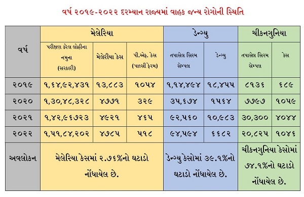 અત્રે વર્ષ ૨૦૨૧ ની સરખામણીમાં વર્ષ ૨૦૨૨ માં મેલેરિયાના કેસોમાં ૨.૭૬ %, ડેન્ગ્યુના કેસોમાં ૩૯.૧ % જ્યારે ચીકનગુનિયાના કેસોમાં ૭૪.૧ ટકા જેટલો મહત્વનો ઘટાડો નોંધાયો છે.