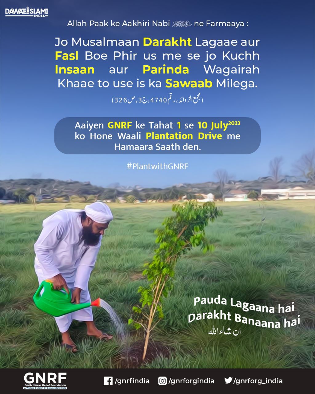 સુન્ની મુસ્લિમોની ધાર્મિક સંસ્થા દાવતે ઈસ્લામીએ પ્રિયદેશ ભારતમાંથી વાયુ પ્રદૂષણ ઘટાડવા માટે દેશભરમાં તેના હજારો સ્વયંસેવકો દ્વારા લાખો વૃક્ષો વાવવાનો નિર્ણય લીધો છે. الحمد للہ આ સંદર્ભે ભારતીય પરિષદના સભ્ય જનાબ હાજી યુસુફ અત્તારીએ માહિતી આપી હતી કે બગડતા હવામાન અને બદલાતા વાતાવરણને જોતા સમગ્ર વિશ્વમાં ગ્લોબલ વોર્મિંગનું જોખમ નોંધપાત્ર રીતે વધી ગયું છે. એવા કપરા સંજોગોમાં સુન્ની મુસ્લિમોની ધાર્મિક સંસ્થા દાવતે ઇસ્લામી તેના લોકસેવા કલ્યાણ વિભાગ GNRF હેઠળ છેલ્લા ઘણા વર્ષોથી વૃક્ષારોપણ અભિયાન ચલાવી રહી છે. આ ચળવળ હેઠળ સમગ્ર ભારતભરમાં લાખો છોડ વાવવામાં આવ્યા છે. તદઉપરાંત આ અભિયાનને વધું સફળ બનાવવા માટે 1 જુલાઈથી 10 જુલાઈ સુધી સમગ્ર ભારતમાં વૃક્ષારોપણ અભિયાન હાથ ધરવામાં આવનાર છે, આ ઝુંબેશને સફળ બનાવવા માટે 1 થી 10 સુધીનો એક્શન પ્લાન તૈયાર કરવામાં આવ્યો છે, જે અંતર્ગત દરેક જિલ્લામાં મોટા પાયે જાહેર સભા યોજીને લોકોને વૃક્ષારોપણના મહત્વ વિશે જાગૃત કરવા માટે હોર્ડિંગ અને જાહેરાતો દ્વારા શહેરમાં લોકોને પ્રોત્સાહિત કરવામાં આવશે.