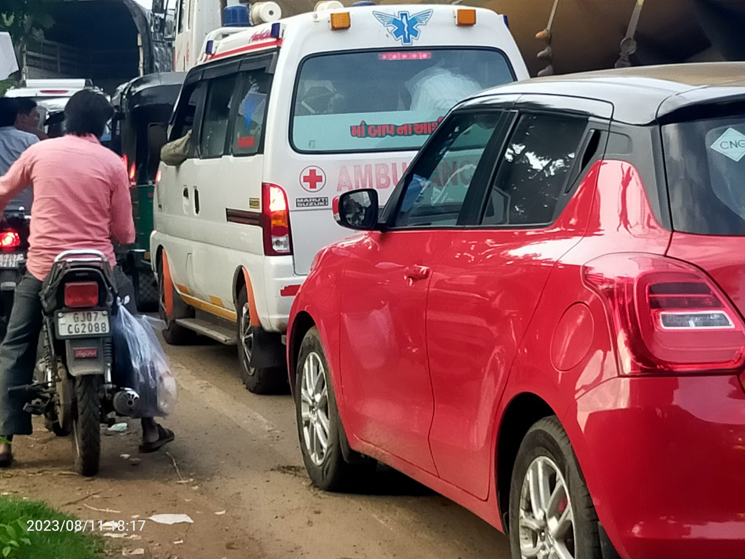સાંકળી ફાટક ને કારણે એમ્બ્યુલન્સ વાન પણ ટ્રાફિકમાં ફસાઈ.