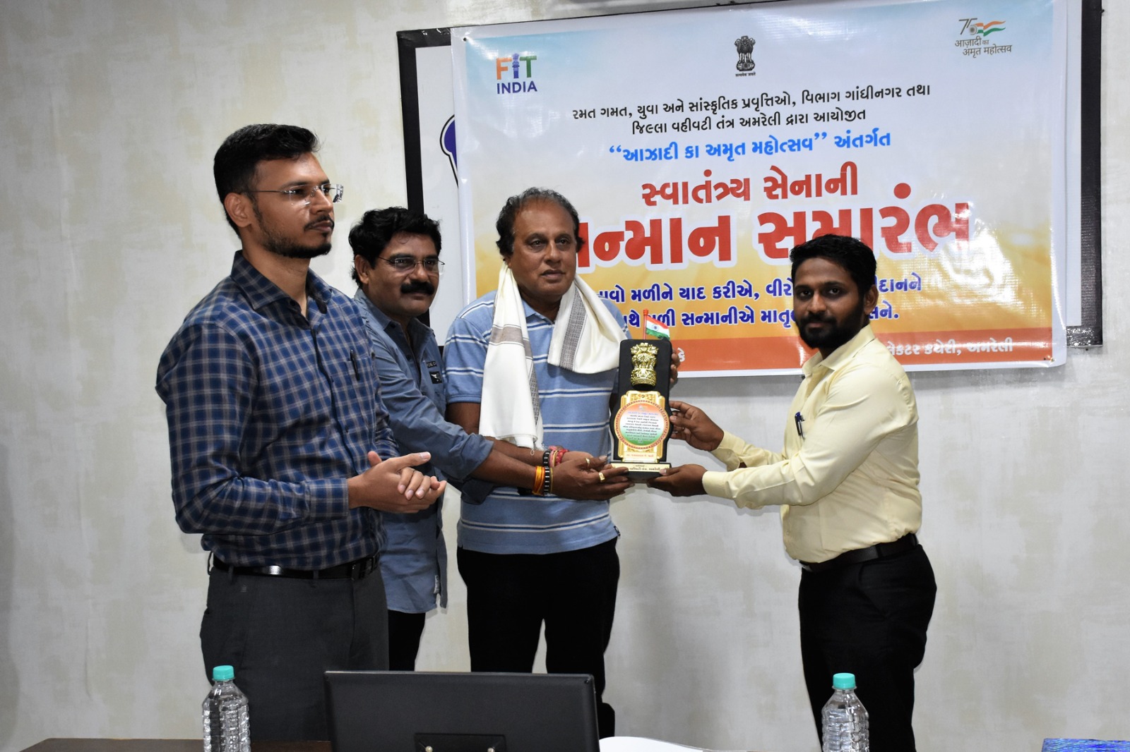 રમત ગમત, યુવા અને સાંસ્કૃત્તિક પ્રવૃત્તિ વિભાગ ગાંધીનગર તથા જિલ્લા વહીવટી તંત્ર અમરેલી દ્વારા જિલ્લા સેવા સદન, અમરેલી ખાતે સ્વાતંત્ર્ય સેનાનીઓના સન્માનનો કાર્યક્રમ જિલ્લા કલેક્ટરશ્રી અજય દહિયાના અધ્યક્ષ સ્થાને યોજાયો હતો. જિલ્લાના પાંચ સ્વાતંત્ર્ય સેનાની અને તેમના પરિવારજનોનું શાલ ઓઢાડી સ્મૃતિ ચિન્હ આપીને જિલ્લા કલેક્ટરશ્રી અજય દહિયા અને જિલ્લા વિકાસ અધિકારીશ્રી દિનેશ ગુરવ દ્વારા સન્માન કરવામાં આવ્યુ હતુ.