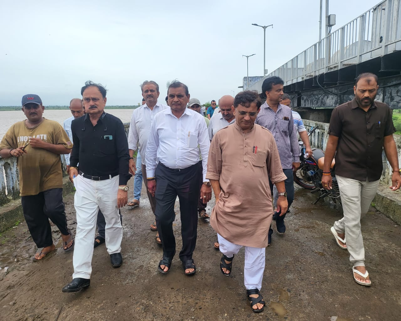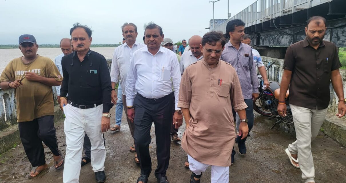 હાથસણી શેલ દેદુમલ ડેમનાં નવા નીરનાં વધામણા કરતા સાંસદ નારણભાઈ કાછડીયા અને ધારાસભ્ય મહેશભાઈ  કસવાલા.