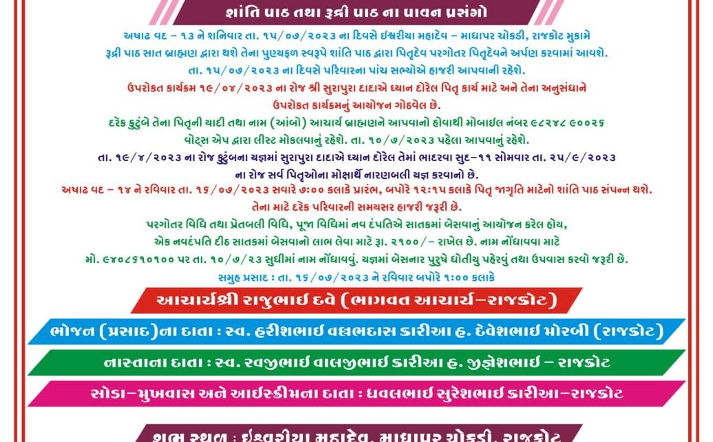 કારિયા પરિવાર દ્વારા પિતૃ જાગૃતિ  માટે શાંતિ પાઠ  તેમજ રુદ્રરી પાઠ નું આયોજન કરેલ છે