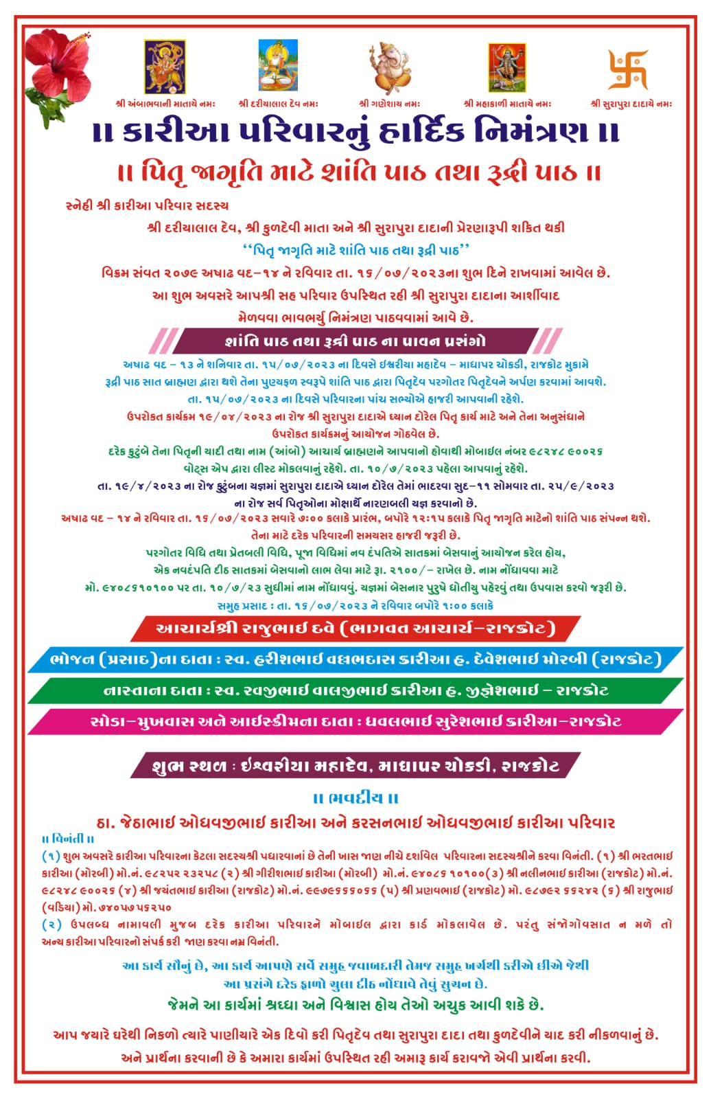કારિયા પરિવાર દ્વારા પિતૃ જાગૃતિ  માટે શાંતિ પાઠ  તેમજ રુદ્રરી પાઠ નું આયોજન કરેલ છે