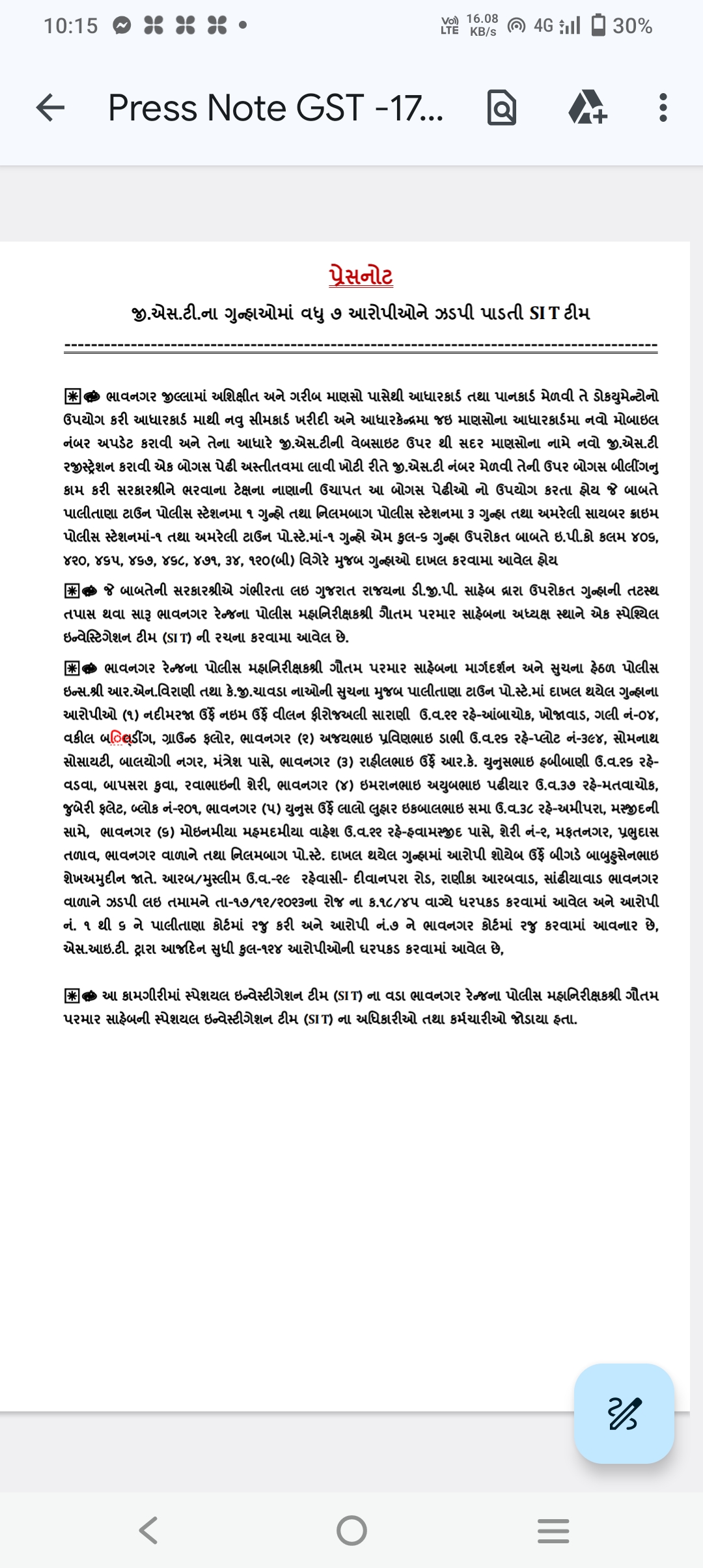 * જે બાબતેની સરકારશ્રીએ ગંભીરતા લઇ ગુજરાત રાજયના ડી.જી.પી. સાહેબ દ્વારા ઉપરોકત ગુન્હાની તટસ્થ તપાસ થવા સારૂ ભાવનગર રેન્જના પોલીસ મહાનિરીક્ષકશ્રી ગૌતમ પરમાર સાહેબના અધ્યક્ષ સ્થાને એક સ્પેશ્યિલ ઇન્વેસ્ટિગેશન ટીમ (SIT) ની રચના કરવામા આવેલ છે.