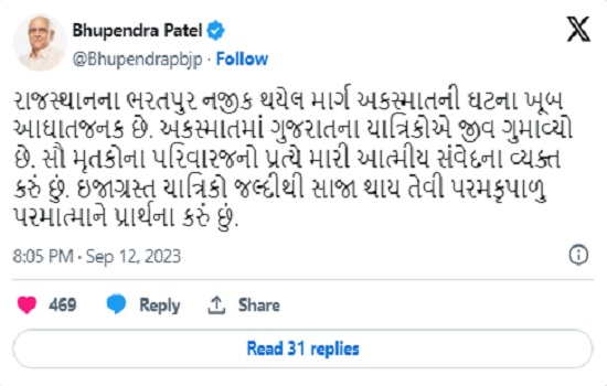 રાજસ્થાનના ભરતપુર નજીક ગુજરાતની બસને અકસ્માત નડ્યો છે. આ માર્ગ અકસ્માતમાં ૧૧ લોકોના ઘટનાસ્થળે જ મોત થયા છે. જ્યારે ૧૨ લોકો ગંભીર રીતે ઇજાગ્રસ્ત થયા છે. ત્યારે આ ઘટનાને લઇને મુખ્યમંત્રી ભૂપેન્દ્ર પટેલે દુઃખ વ્યક્ત કર્યુ છે. તો બીજી તરફ ભાવનગરના સાંસદ ભારતીબેન શિયાળે સમગ્ર ઘટનાને લઇને રાજસ્થાનના તંત્રના સંપર્કમાં હોવાનું જણાવ્યુ છે. સાથે જ ઇજાગ્રસ્તોની સારવાર માટે બનતા તમામ પ્રયત્નો કરવાની ખાતરી આપી છે. ગુજરાતીઓને નડેલા અકસ્માત મુદ્દે ભૂપેન્દ્ર પટેલે ટ્વીટ કર્યુ છે. ગુજરાતી મુસાફરોના મૃત્યે અંગે ઝ્રસ્ ભૂપેન્દ્ર પટેલે શોક સંદેશ વ્યક્ત કર્યો છે. ટ્વીટ દ્વારા ભૂપેન્દ્ર પટેલે મૃતકોને શ્રધ્ધાંજલિ આપી છે. મૃતકોના પરિવારજનોને પ્રત્યે તેમણે સંવેદના વ્યક્ત કરી છે. ભાવનગરના સાંસદ ભારતીબેન શિયાળે ઘટના અંગે દુખ વ્યક્ત કર્યુ હતુ અને જણાવ્યુ હતુ કે ઘટનાને લઇને તેમણે રાજસ્થાનના ભરતપુરના કલેક્ટર સાથે વાત કરી છે અને ઇજાગ્રસ્તોને તાત્કાલિક તમામ પુરતી સારવાર અપાવવા વિનંતી કરી છે.સાથે જ તેમણે ત્યાંના ભાજપના ઘારાસભ્ય સાથે પણ સંપર્ક કરી તમામ લોકોની મદદ કરવા પણ કહ્યુ હતુ.ભારતીબેને જણાવ્યુ હતુ કે મૃતકોના પાર્થિવ દેહને પણ વતન લાવવા માટેની તમામ વ્યવસ્થા કરાવવામાં આવી રહી છે. ગુજરાતના ભાવનગરની બસને નડેલા અકસ્માતની ઘટનામાં ૧૧ના જીવ ગયા છે.ભાવનગરથી મથુરા જઇ રહેલી બસને અકસ્માત નડ્યો હતો. મૃતકો ભાવનગરના તળાજા તાલુકાના દીહોરના વતની હોવાનું સામે આવ્યુ છે. મૃતકોમાં ૬ મહિલા અને ૫ પુરુષોનો સમાવેશ છે. પૂરપાટ ઝડપે આવી રહેલા ટેન્કરે બસને ટક્કર મારી હતી. વહેલી પરોઢે ૪ કલાકે અકસ્માતની ઘટના બની હતી. બસ ભાવનગરની કાર્તિક ટ્રાવેલ્સની હોવાની વિગતો છે.
