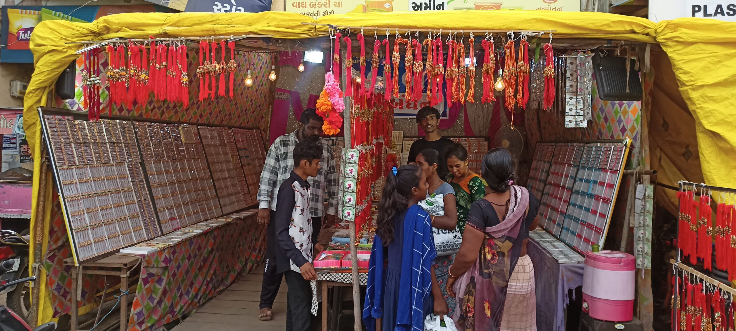 બોડેલી ના બજારોમાં રક્ષાબંધન પર્વે વિવિધ પ્રકારની રાખડીઓ માં ડાયમન્ડ ની રાખડી બહેનોની પ્રથમ પસંદગી બની રહી હોય એમ મોટાપાયે ખરીદી હાથ ધરાઈ હતી.